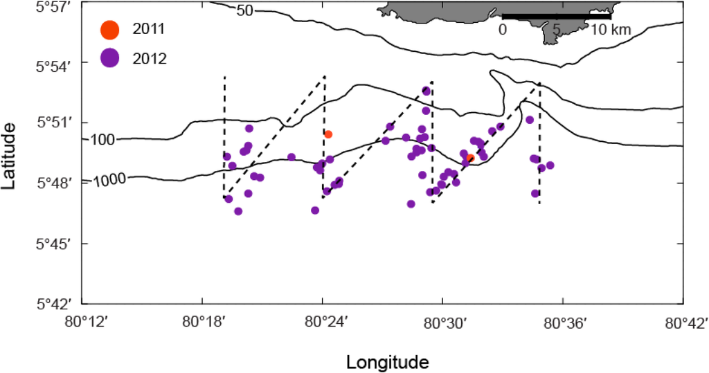 The systematic survey transect was designed to cover a range of water depths from the continental shelf to over 1000 m, and included the continental slope and the submarine canyon off Dondra (Figure 1b). It was intended to provide an indication of blue whale distribution over the selected study area.
