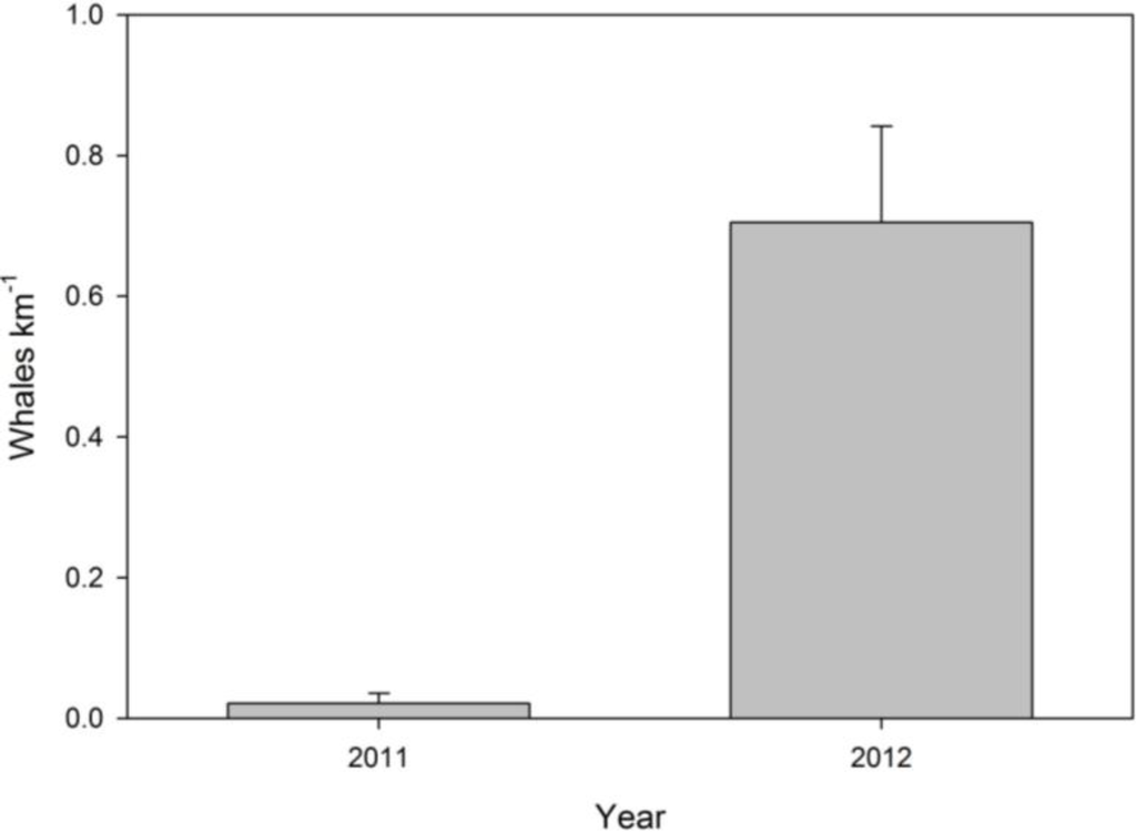 Systematic surveys were conducted twice each during 2011 and 2012 and covered a total of 368 km. Time spent on effort in both years was comparable (Table 1). Overall few blue whales (n = 2) were recorded during the systematic transects in 2011. In contrast, in 2012, an increased number of whales were recorded during the surveys (n = 66) (Table 1; Figure 4). A one-way analysis of variance revealed significant differences between the number of whales sighted per km of trackline in 2011 and 2012, F(1,12) = 24.4769, p < 0.001, n = 14 (Figure 5).
