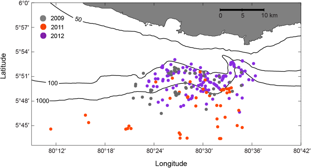 Blue whale sighting data were adjusted based on radial angle and distance to sighting. The data were then plotted in distribution maps of blue whale sightings using the M_Map package in MATLAB [18] representing (a) systematic surveys (2011 and 2012) and (b) opportunistic encounters (2009, 2011 and 2012).