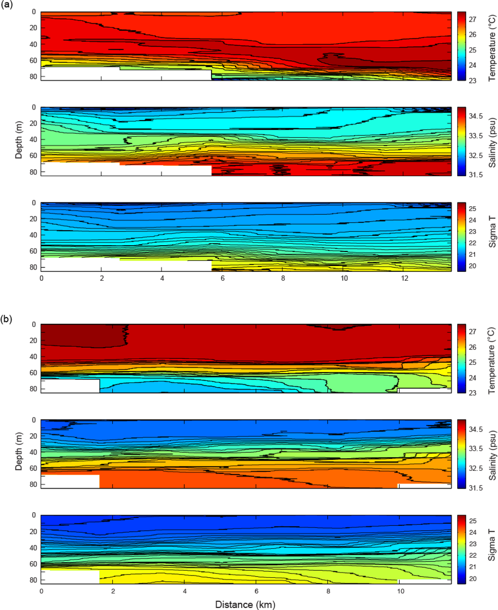 Contour plots for temperature, salinity and density (measured in sigma-t) for the two contrasting years; (a) 2011 and (b) 2012.