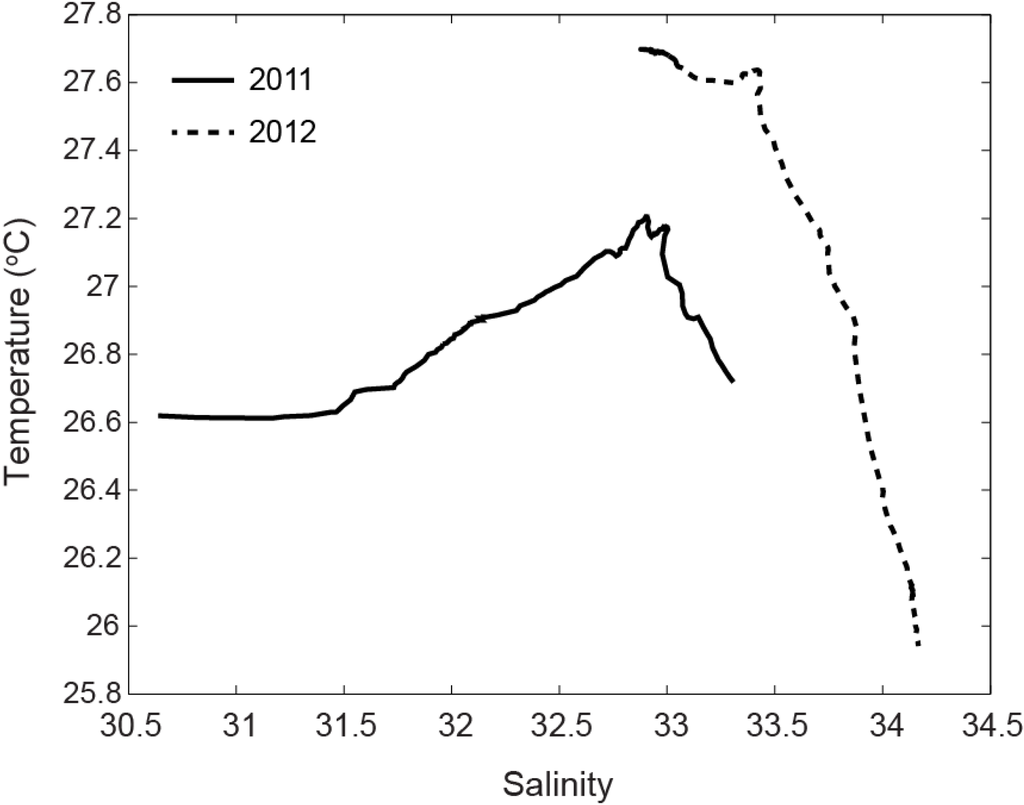 The marked differences in salinity and temperature between the two years are evident in Figure 8. The temperature-salinity plot shows that in 2011 temperature in the water column was uniform (over a 0.6 °C range) over a wider salinity range—from 30.5 to 33.5 PSU. However, in 2012 salinity showed less variation (ranging 1.2 PSU) while temperature covered a wider 1.7 °C range.