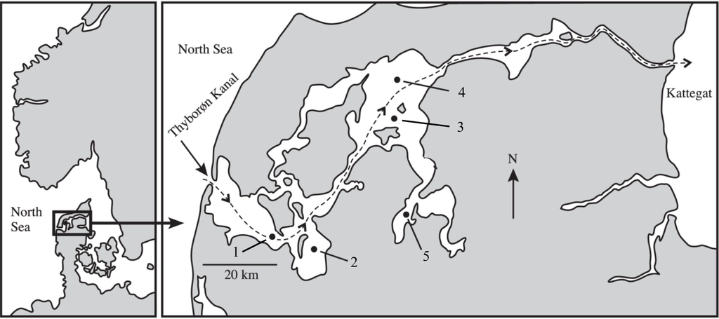 Limfjorden (Denmark) is not a true fjord, but a 1500 km2 water system that connects the North Sea via Thyborøn Kanal in the west with the Kattegat in the east (Figure 1). It consists of several basins that are separated by shallow waters or narrow sounds. The mean depth is 4.9 m, and maximum depth is 28 m. The tidal amplitude is 10 to 20 cm, and vertical mixing is mainly wind driven. A dominating strong west–easterly wind creates an eastward current that brings high salinity (usually >30 psu) North Sea water into Limfjorden, which also receives freshwater from the surrounding land area. This results in a salinity gradient from west to east and brackish water (20–25 psu) in the inner parts [1,2,3,4]. Inflowing water to Limfjorden usually origins from the Jutland Coastal Current that flows northwards along the Danish western coast, carrying mixed water masses from the English Channel and the southern North Sea [5,6,7,8]. The water exchange in Limfjorden is mainly caused by 50 to 70 yearly incidents where strong westerly winds press North Sea water through Thyborøn Kanal into Limfjorden and which are then followed by backflow of water from Limfjorden into the North Sea during more calm weather situations (Figure 2). Every year, about 70 km3 of North Sea water enters into Limfjorden via Thyborøn Kanal, and about 65% of this water flows eastwards into the central parts that additionally receive about 3 km3 freshwater so that approximately 8.7 km3 on a yearly basis runs eastwards to Kattegat [8]. The generally poor oxygen conditions and yearly mass killing of the benthic animals (i.e., fish food) may explain the disappearance of bottom-dwelling (demersal) fish. Fisheries monitoring in the period 1980–2009 showed that the total catch of certain demersal fish species (plaice, flounder, eelpout, eel, and bullhead) in a standard trawl rapidly decreased from 1980 to 1993 whereupon virtually no fish were caught ([9], Figure 10 therein). In the same period, the abundance and thus the ecological importance of jellyfish seem to have increased, but the two phenomena are not directly linked. Thus far, the demersal fish populations have not shown any sign of recovery, even though commercial fishing was given up in the 1970s. The steep reduction in the abundance of demersal fish is probably caused by a combined effect of oxygen depletion, predation impact by cormorants and seals [10], and in the case of plaice, also less recruitment to Limfjorden due to a reduced population in the North Sea [8].