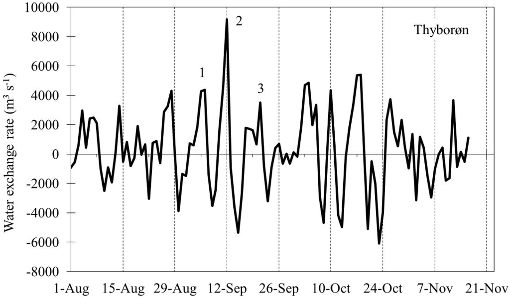 Water exchange in Limfjorden is mainly caused by strong westerly winds inducing intrusions of North Sea water through Thyborøn Kanal (Figure 1) and subsequent backflow of water during periods with more calm weather. The figure shows the daily water exchange rates through Thyborøn Kanal during the period 1 August to 16 November 2011. Incidents of three intrusions of water from the North Sea between the end of August to the middle of September 2011 are indicated (1–3). Easterly currents are indicated with positive values on the y-axis. From Riisgård et al. [8].