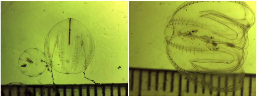 (left) Pleurobrachia pileus; (right) Mnemiopsis leydi collected in Løgstør Bredning 2 October 2012. Interval on scale = mm. Photo: Hans Ulrik Riisgård.