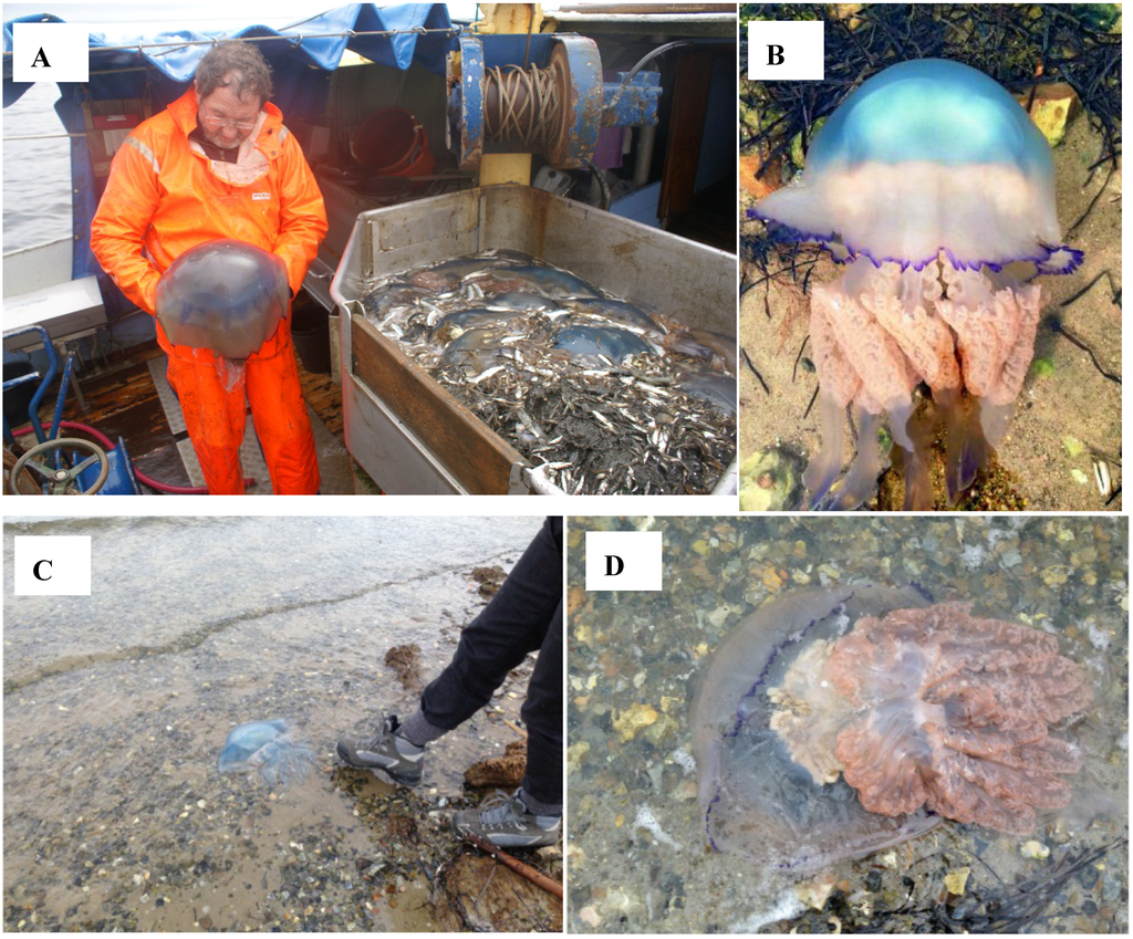Jellyfish from the North Sea observed in Limfjorden. (A) Rhizostoma octopus caught in Limfjorden (Risgårde Bredning) 17 September 2012 by DTU-Aqua during a fisheries monitoring survey. Photo: Erik Hoffmann; (B) Stranded R. octopus on the beach near Glyngøre, Limfjorden, on 7 September 2013. Note the characteristic jagged purple bell edge and reddish oral arms. Photo: Joan Thora E. Laurberg. (C,D) R. octopus stranded on the beach (Lysen Bredning, near Salling Sund, Limfjorden) 22 September 2013. Photo: Hans Ulrik Riisgård.