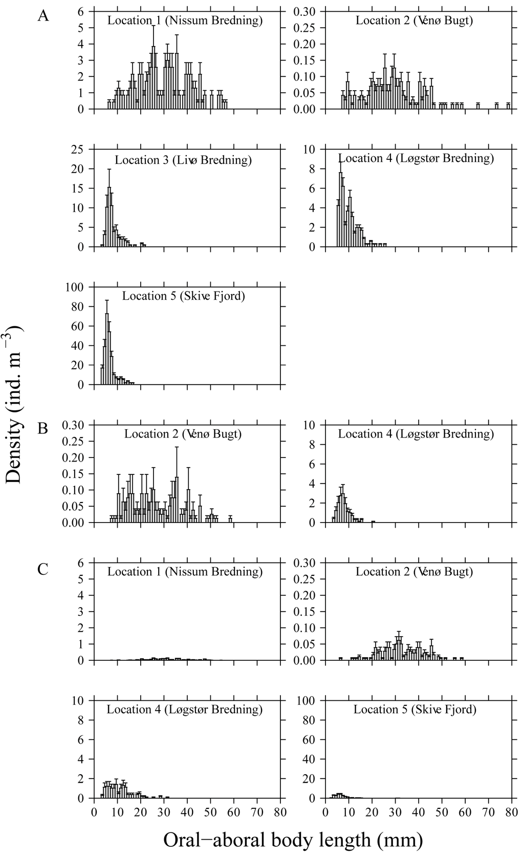 Mnemiopsis leidyi. Oral–aboral length distribution of ctenophores for the five investigated locations in Limfjorden on: (A) 23 September; (B) 23 October; and (C) 20 November 2013. Average densities for each mm size category are displayed (±SD for the three replicate samples at each location).