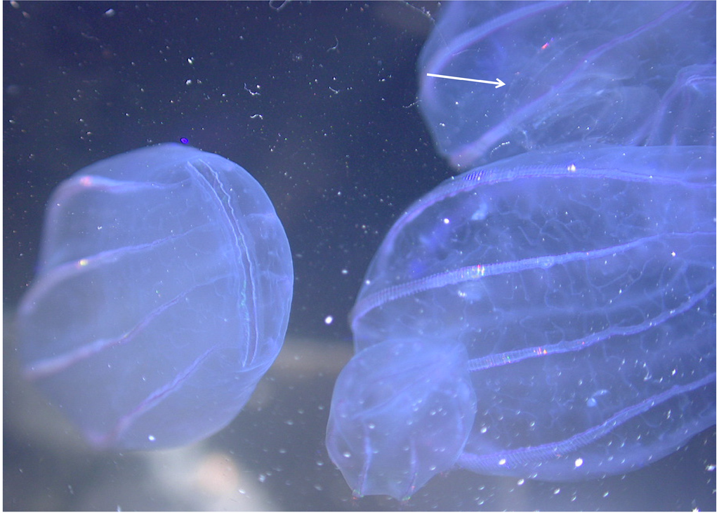 Beroe ovata collected in Limfjorden 20 November 2013. Note the prey organism (Mnemiopsis leidyi) in the gastrovascular cavity of the B. ovata in upper right corner (arrow). Photo: Hans Ulrik Riisgård.