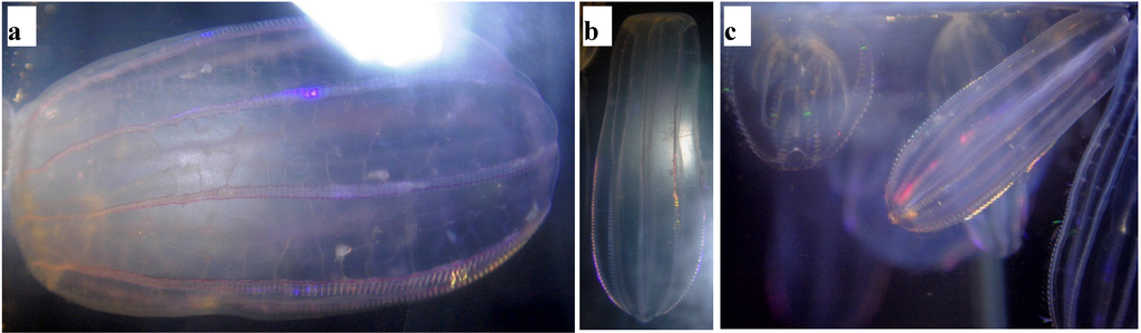 (a) Beroe cucumis; (b) B. gracilis; and (c) mixture of ctenophores (M. leidyi on the left and three individuals of B. gracilis on the right frontal view) collected in Limfjorden 20 November 2013. Photo: Hans Ulrik Riisgård.