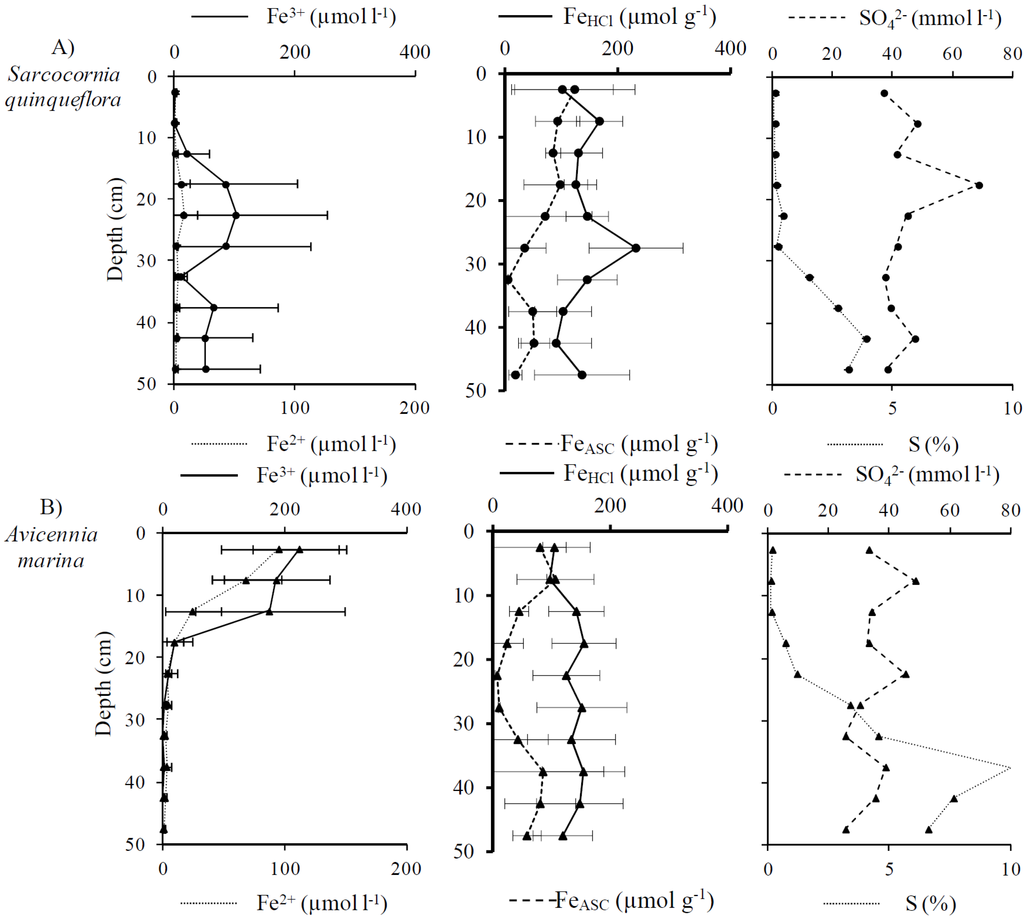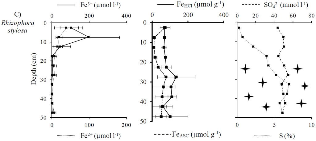 - Ferreira, T.O.; Otero, X.L.; Vidal-Torrado, P.; Macías, F. Effects of bioturbation by root and crab activity on iron and sulfur biogeochemistry in mangrove substrate. Geoderma 2007, 142, 36–46. [Google Scholar] [CrossRef]