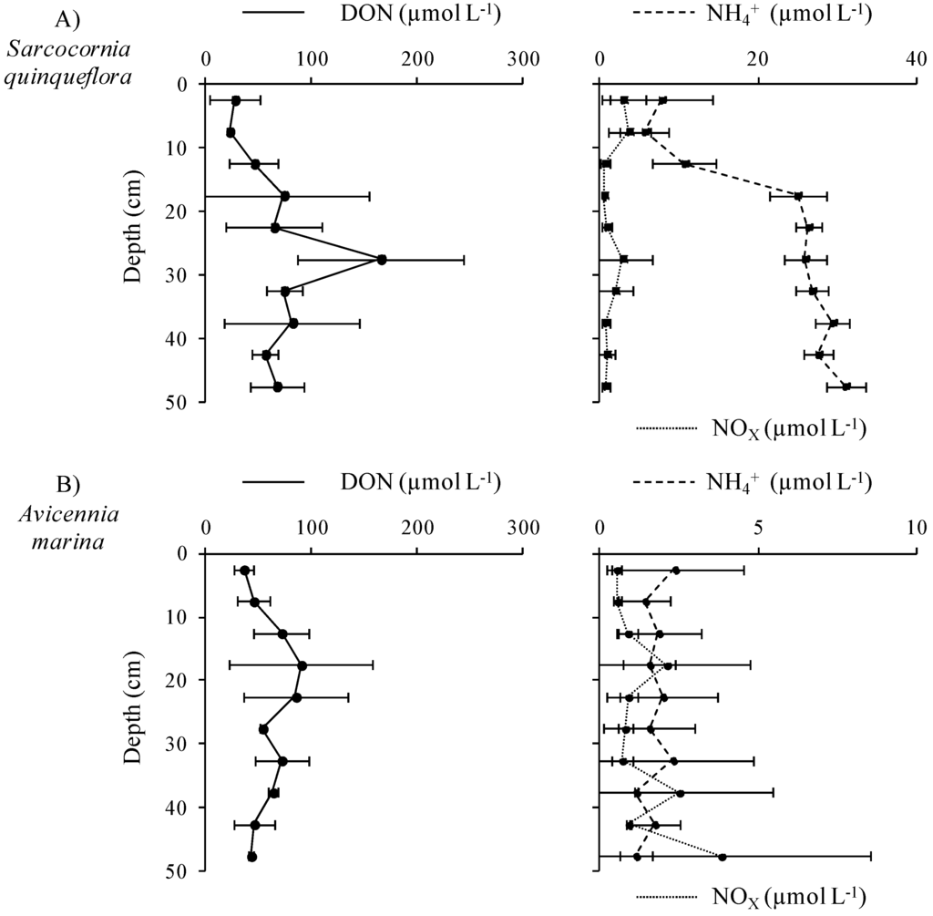 3.3.1. Distribution and Speciation of Nitrogen Species along the Mangrove Zonation