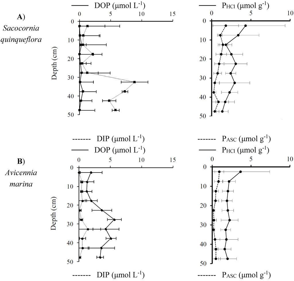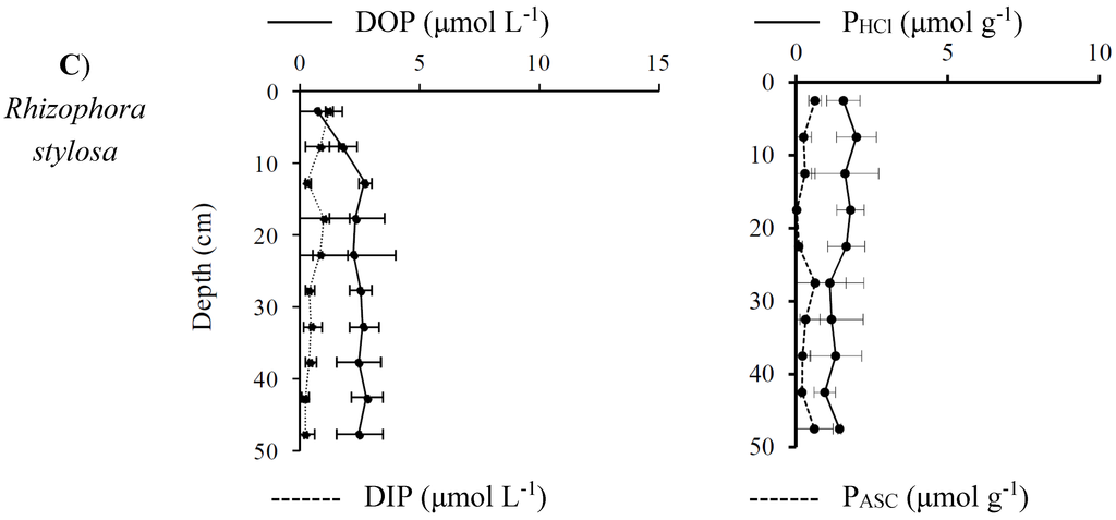3.3.2. Distribution and Speciation of Phosphorus Species along the Mangrove Zonation