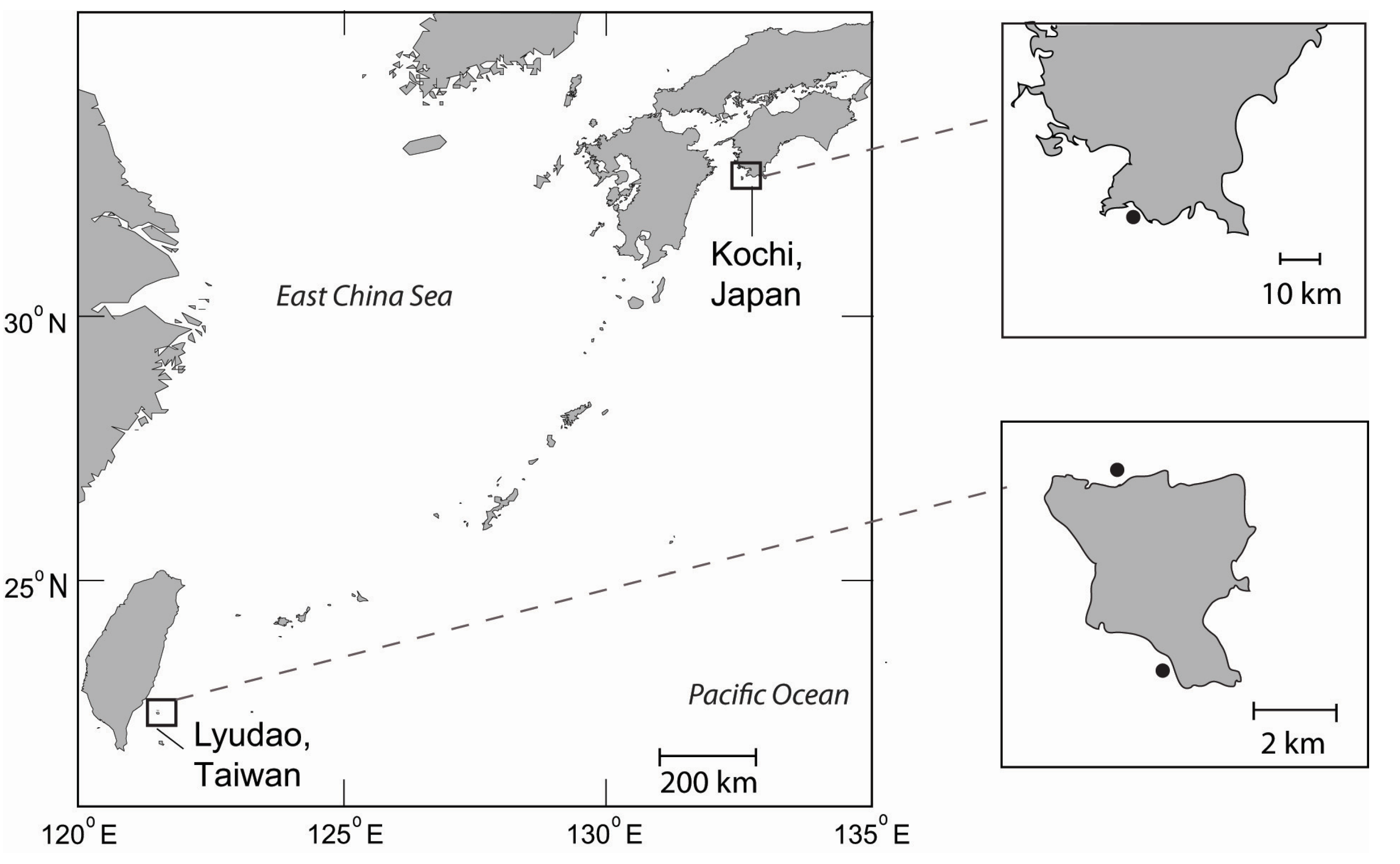 Map of the study region in Southeast Asia, including the two study locations: Lyudao (Taiwan) and Kochi (Japan). The black dots indicate the collection sites Da-Bai-Sa and Chai-Kou in Lyudao (resp. the southwest and the north) and in front of the Biological Institute on Kuroshio in Nishidomari, Kochi.