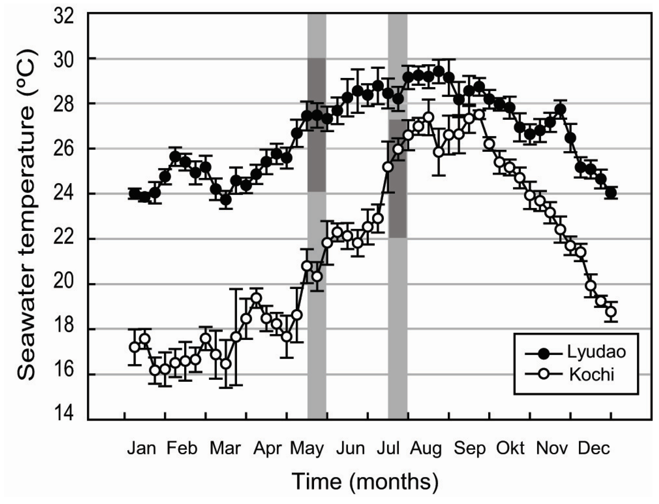 Seawater temperature (weekly averages ± SD) in 2011 at the study locations in Lyudao (Guei-wan 5 m depth) and Kochi (Nishidomari 5 m depth). The light grey zones indicate the spawning periods in May (for Lyudao) and July (for Kochi). The dark grey zone accentuates the temperature during the main spawning period at each location (April–June in Lyudao; July–August in Kochi).