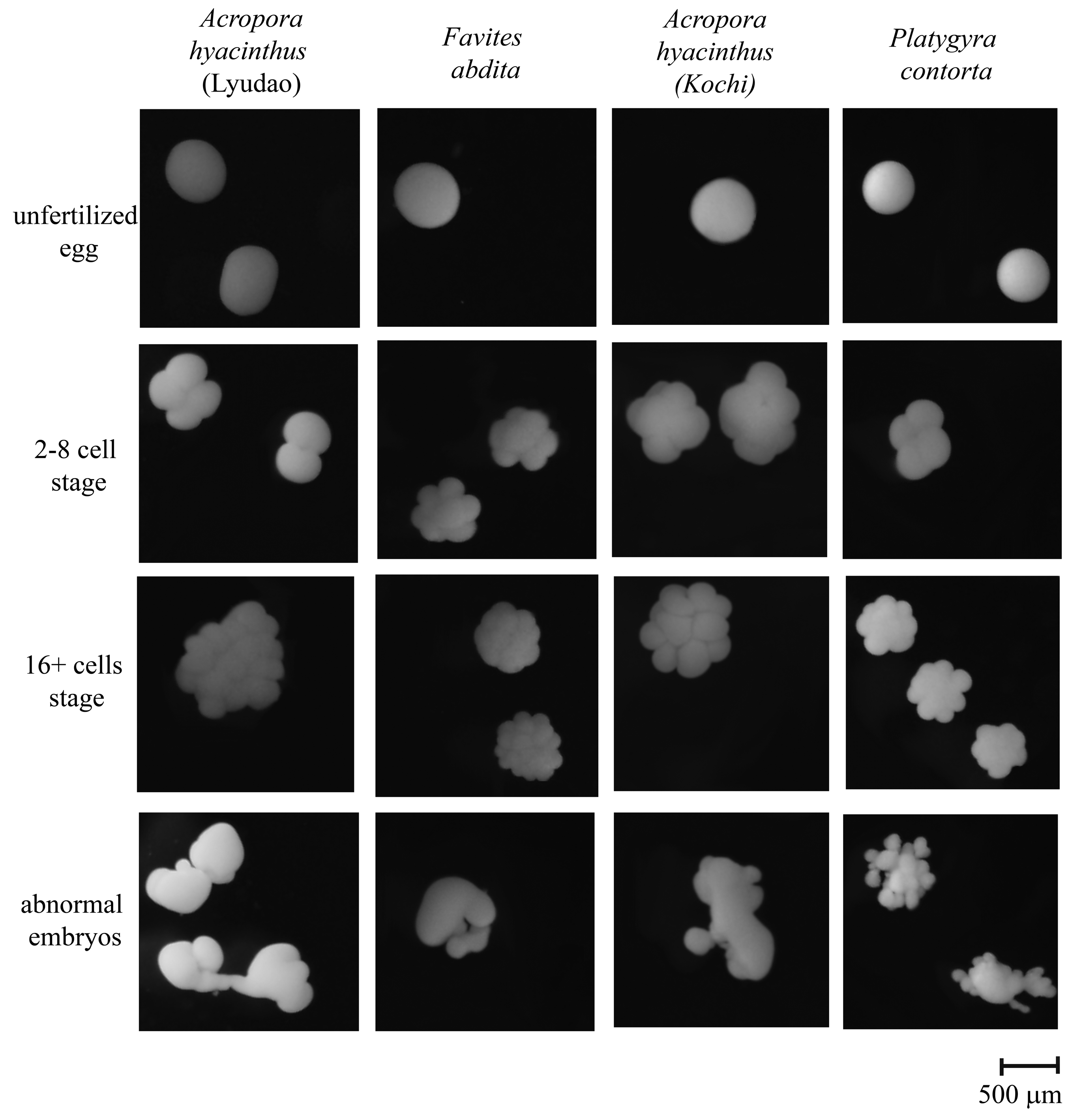Representative pictures showing different stages of embryonic development and abnormal development of each coral species studied.