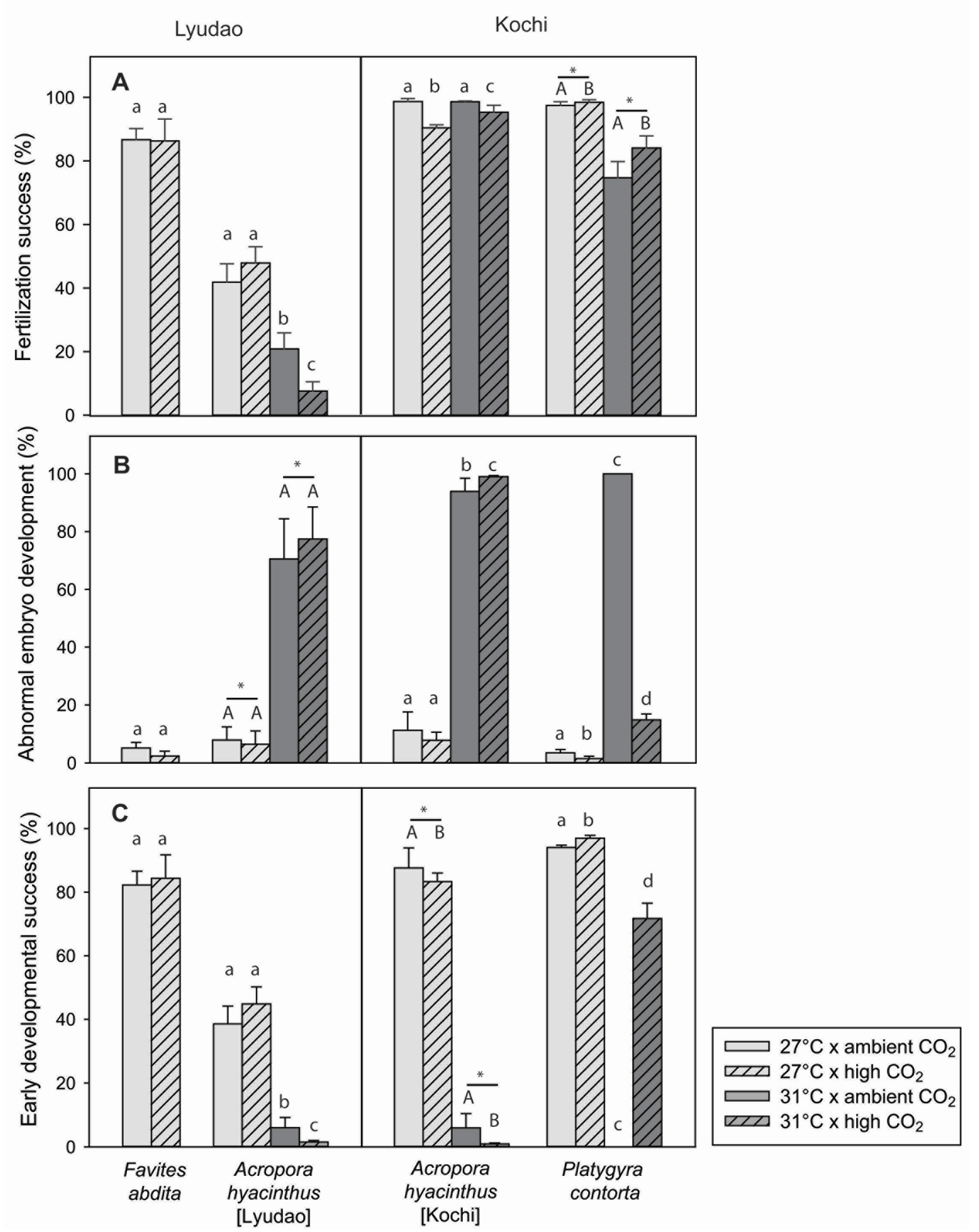 The effect of temperature (27 °C vs. 31 °C) and CO2 level (400 vs. 1000 μatm CO2) on (a) the fertilization success, (b) abnormal development, and (c) early developmental success of different species in Lyudao and Kochi. Values are mean ± SD. Means lacking a common superscript differ significantly (p < 0.05). Asterisks with bars mark significant main effects of temperature, whereas different capital letters mark significant main effects of CO2 level. In those cases where a significant interaction between temperature and CO2 level was detected, individual significant effects are marked by different lower case letters (p < 0.05). See Table 1, Table 2, Table S2 and S3 for an overview of the statistics.