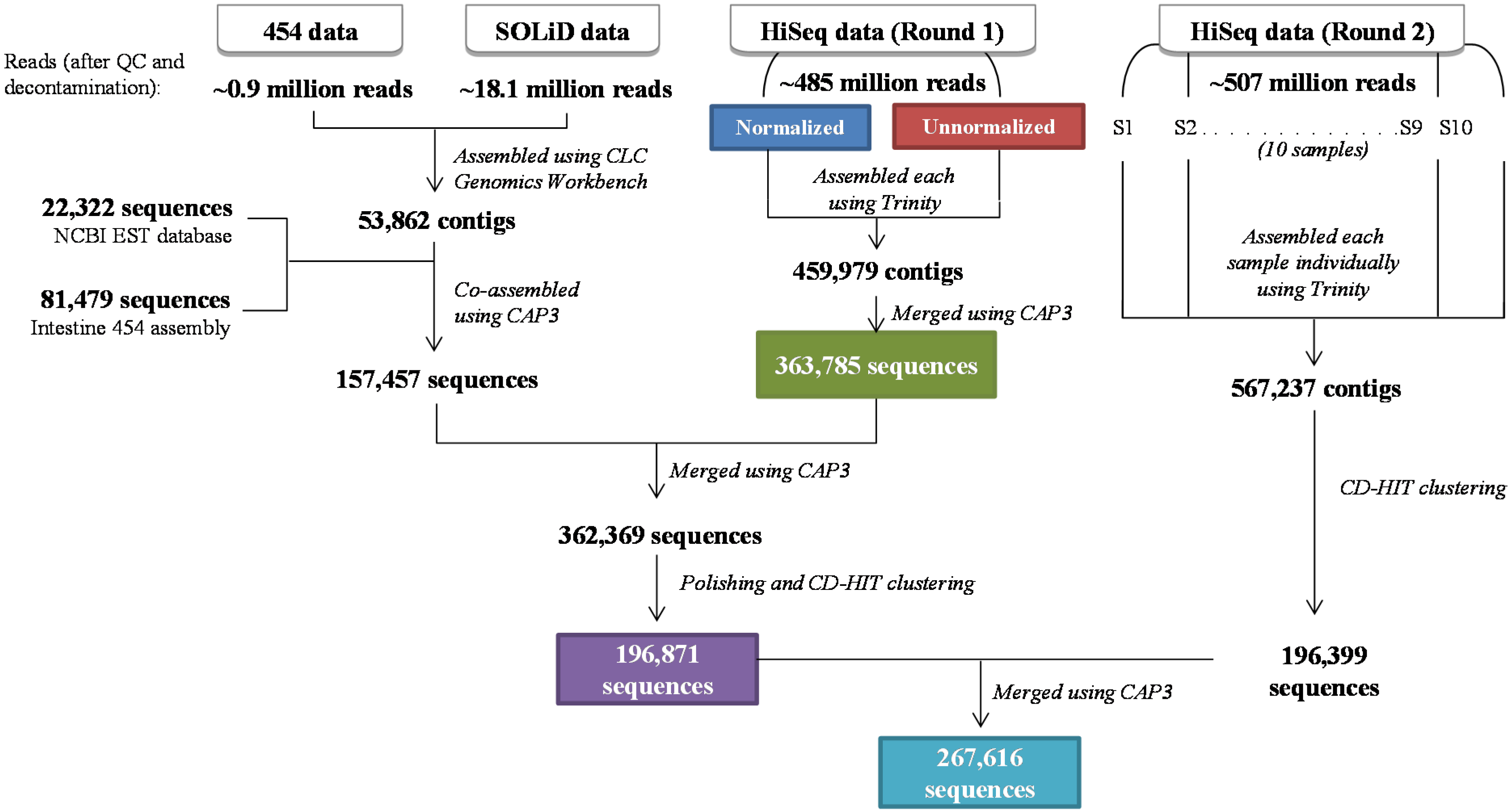 The assembly of the filtered reads from various platforms was performed in a step-wise manner, as shown in the flowchart in Figure 1. The 454 and SOLiD data were co-assembled using the “De novo Assembly” tool in CLC Genomics Workbench (version 5.1; 80% length fraction, 80% similarity fraction, with default insertion, deletion and mismatch costs), and then merged with ~22,000 Asian seabass EST sequences from NCBI Genbank (Download date: 26 July 2012) as well as the published Asian seabass intestine assembly [9], using CAP3 (with default parameters). The resulting contigs were then further merged using CAP3 with an earlier HiSeq-based version of the transcriptome [6], to produce the multiplatform (MP) assembly. The HiSeq derived data were from strand-specific cDNA libraries, which marked the orientation of the reads with respect to the mRNA, greatly reducing the complexity of the assembly process. The data from HR2 comprising ten libraries were assembled independently using Trinity (version 10/11/2013), and the resulting assemblies were combined and subjected to a redundancy removal using cd-hit-est (CD-HIT version 4.6.1 with parameters -aS 0.98, -c 0.98) to produce a non-redundant dataset. Finally, the HR2 assembly was merged with the polished MP assembly (see Supplementary File 1 for polishing steps) to generate the “final multiplatform” (FMP) transcriptome sequence dataset [21].
