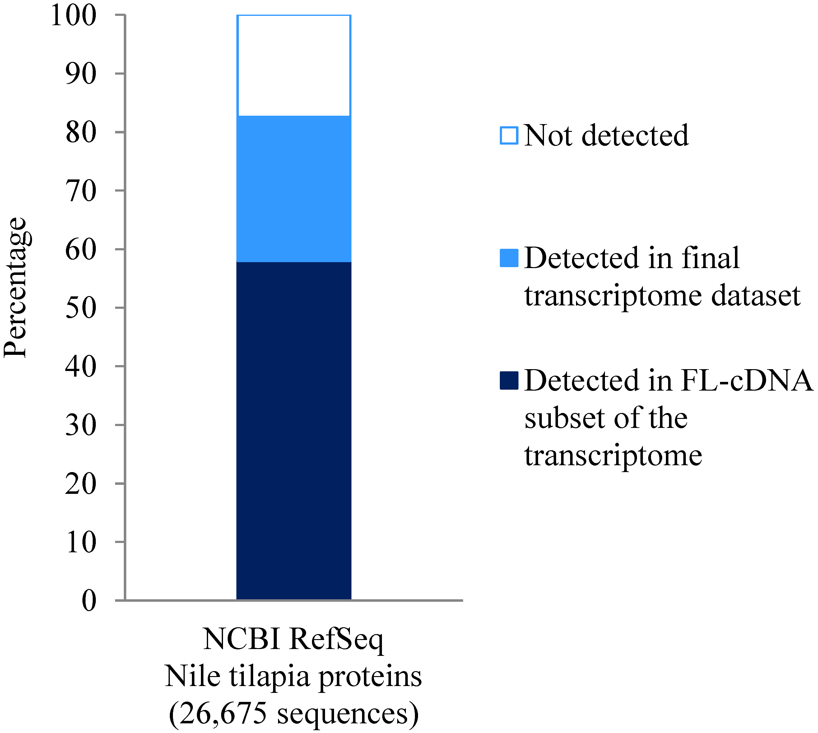 Proportion of the Nile tilapia RefSeq protein dataset that was detected in the final Asian seabass transcriptome as well as the full-length cDNA (FL-cDNA) subset. Using BLASTX, ~83% of the Nile tilapia RefSeq sequence homologs were detected in the Asian seabass transcriptome, while ~58% were represented in the FL-cDNA subset.