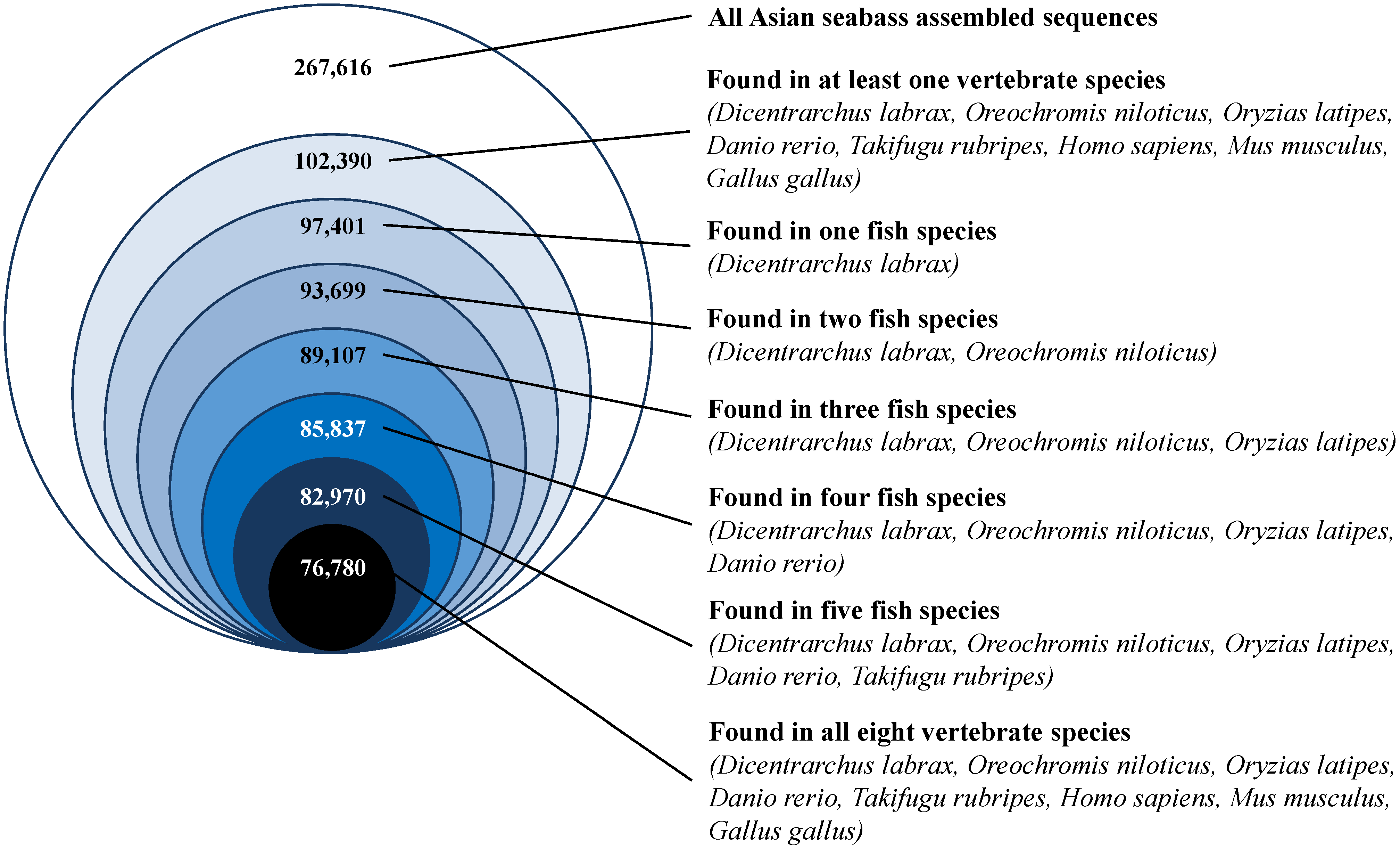 Conservation of Asian seabass transcriptome sequences across eight vertebrate species, including five teleost fish species. Based on a BLASTX search of the final transcriptome assembly with the European seabass predicted protein dataset (Dicentrarchus labrax) and the RefSeq protein datasets of the Nile tilapia (Oreochromis niloticus), Japanese medaka (Oryzias latipes), zebrafish (Danio rerio), spotted green pufferfish (Takifugu rubripes), human, mouse and chicken, ~38% of the contigs were found to have a hit with at least one species, out of which ~81% were found in all five teleosts and ~75% were found in all eight vertebrates.