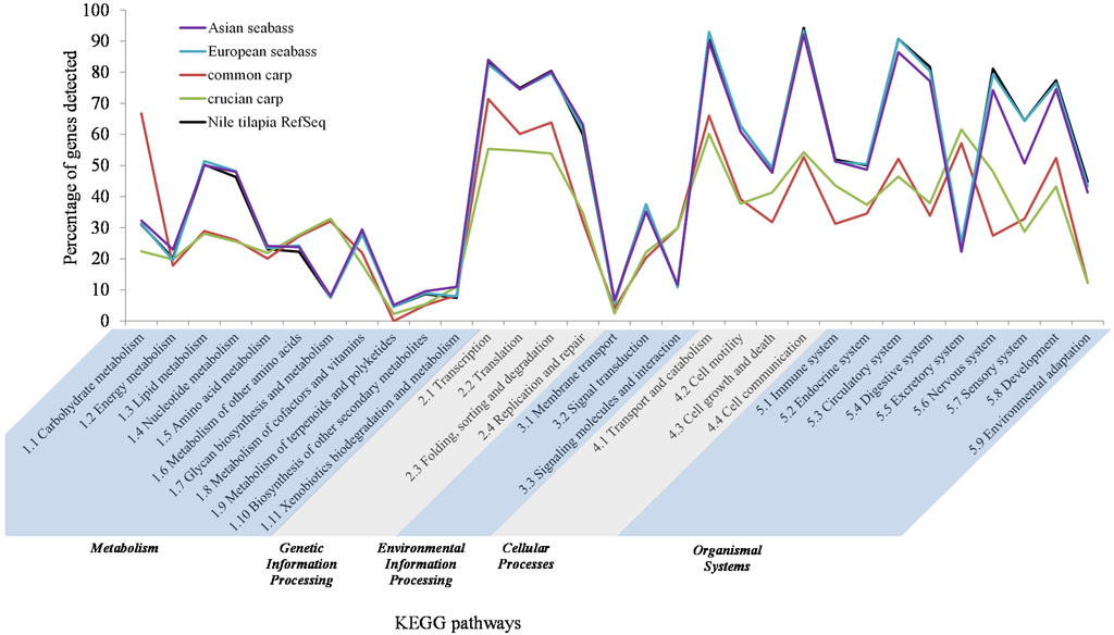 Percentage of KEGG pathway genes detected in the Asian seabass final transcriptome assembly, shown in comparison to the European seabass protein dataset, common carp and crucian carp transcriptomes, as well as the Nile tilapia RefSeq protein dataset. The KEGG pathways are shown in five main categories. The “genetic information processing”, “cellular processes” and “organismal systems” categories were well represented in the Asian seabass transcriptome, while the “metabolism” and “environmental information processing” categories had a lower representation.
