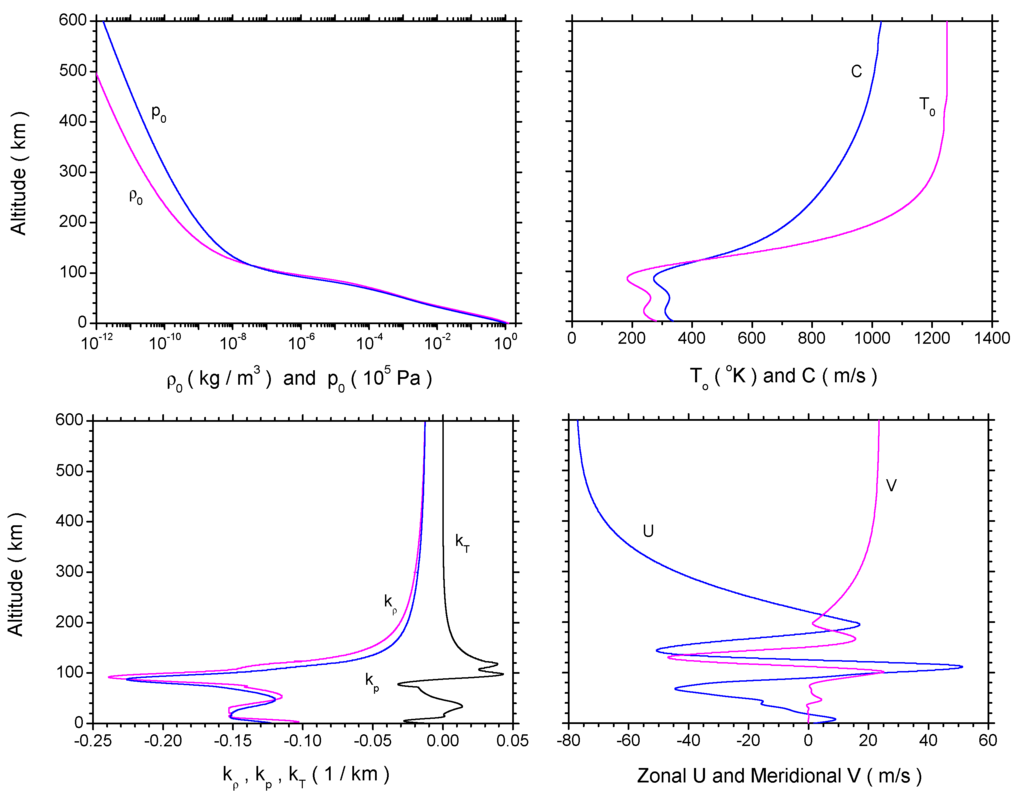 The vertical profiles up to 600 km height of the undisturbed mean-field parameters , as well as related are calculated by employing the two empirical neutral atmospheric model, NRLMSISE-00 [88] and horizontal wind model, HWM93 [89]. We arbitrarily choose a position at 60° latitude and −70° longitude for a local apparent solar time of 1600 h on the 172th day of a year, with supposed daily solar flux index and its 81-day average of 150. The daily geomagnetic index is assumed 4. Figure 1 demonstrates the mean-field profiles of the neutral atmosphere. The upper left panel gives (pink) and (blue). Density decreases all the way up from 1.225 kg/m (or, ) at the sea level to only kg/m at 600 km altitude. Pressure has a similar tendency to . It reduces from 10 Pa at the sea level to Pa finally. The upper right panel presents (pink) and C (blue). Temperature is 281 °K at the sea level. It decreases linearly to 224 °K at 13 km, and then returns to 281 °K at 47 km, followed by a reduction again to 146 °K at 88 km. Above this height, the temperature goes up continuously and reaches a stable exospheric value of ∼1250 °K above 400 km altitude. At 194 km it is 1000 °K. Sound speed C follows roughly the variation of . At the sea level, it is 336 m/s; at 600 km altitude, it is around 1.2 km/s. The lower left panel dipicts (pink), (blue), and (black). Up to 200 km altitude, keeps alive, thus, the isothermal condition is broken in atmosphere, except at three heights: 13.1 km, 47.2 km, and 87.9 km where . However, above 100 km altitude, eventually keeps its positive polarization after two times of adjustment from negative to positive values. Above 200 km altitude, can be considered valid. Note that the scale height H is equal to . At the sea level, H is calculated as 8.44 km. It soars to as high as 75.6 km when approaching to about 200 km altitude and beyond. The lower right panel illustrates U (blue) and V (pink). Both of them oscillate twice dramatically in altitude within m/s in amplitude below 200 km altitude. Above this height, their magnitudes grow monotonously with height to 75 m/s and 23 m/s, respectively.
