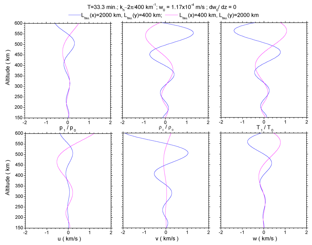 Under the initial condition, m/s, as given in Subsection 2.1, and assuming at the sea level, we use an adaptive-step, 4th-order Runge-Kutta method to solve the Taylor-Goldstein equation, Equation (4). Note that the initial conditions of the six perturbations are all determined by and . This is an alternative approach to the amplification of upward propagating tsunami-driven surface waves in addition to the traditionally used plane-wave linearization method. In order to show the features of tsunami waves of different horizontal scale sizes but with the same horizontal wavenumber km, we take into account a couple of cases: one has specific scale sizes of 2000 km and 400 km in the x and y directions, respectively; the other has 400 km and 2000 km, respectively. Clearly, the -ratios in the two cases are 1/5 and 5/1, respectively. The profiles of all the perturbations and in the F layer (150–600 km altitudes) are demonstrated in Figure 2 where the curves of the two cases are in blue and pink, respectively.