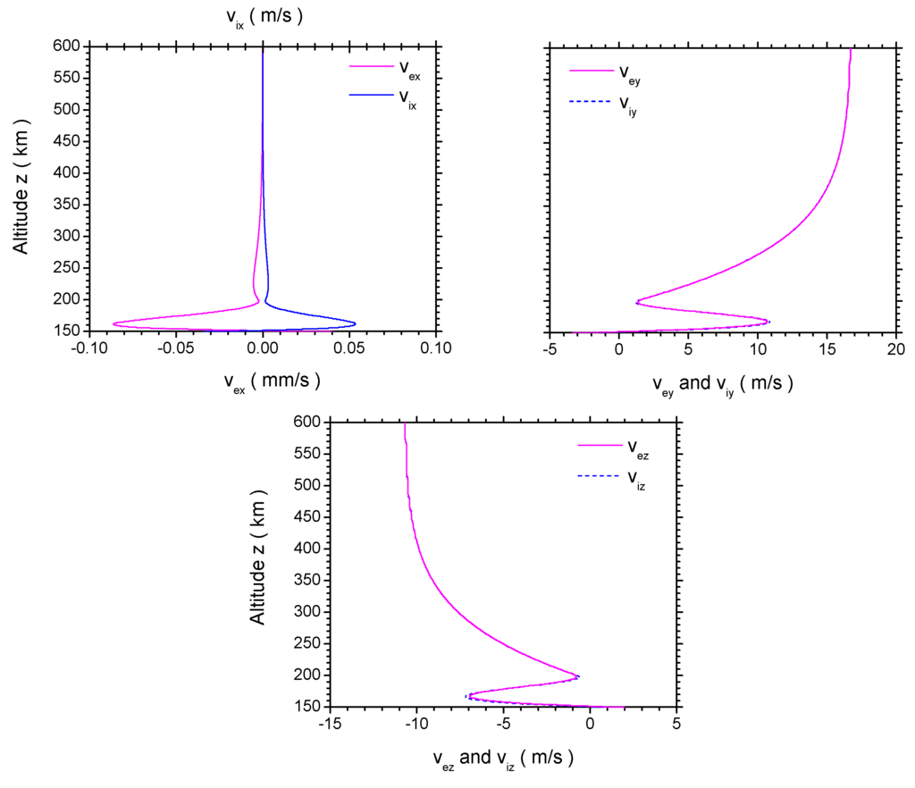 In the above equations, the relative importance of the terms related to pressure gradient and gravity can be estimated as follows. Considering rad/s and rad/s, and, tens of m/s in ionosphere, we have –, or, the -terms in both of the and equations contribute to an additional drift of no more than several cm/s, much less than . Thus, the -terms can be reasonably omitted. Similarly, for the pressure gradient terms, the thermal speed of charged particles is in the order of –242 km/s. Because –, where is the scale height more than 8 km, we obtain