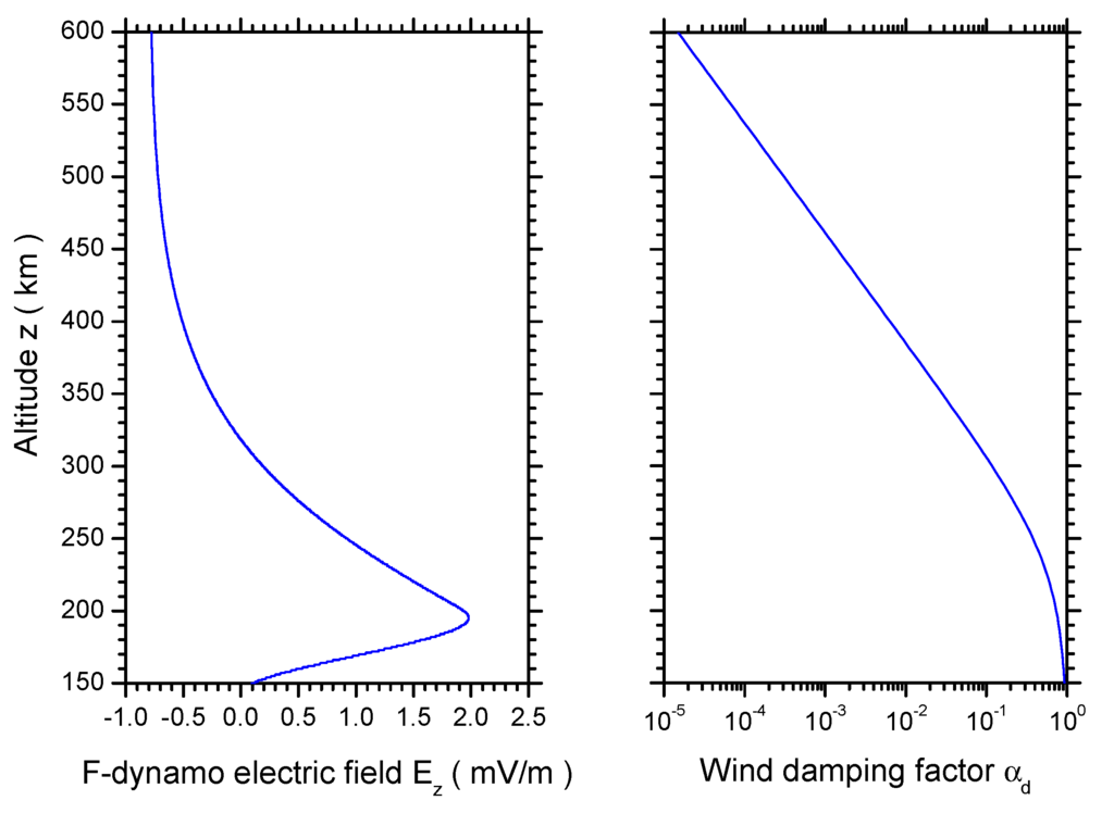 By selecting km as the reference altitude, where , to calculate electric field strength as expressed by Equation (46), the LHS panel of Figure 5 depicts the vertical profile of the electric field in the ionospheric F layer. The field strength is in an order of mV/m, enhancing to 2 mV/m at ∼200 km altitude, then decreasing exponentially versus altitude upward. Above 500 km altitude, it finally stabilizes at about −0.78 mV/m. In the plasma rest frame, this field induces an drift of (−25∼+50) m/s, the same order as the neutral wind speeds. It is therefore necessary to take into account the effect of the dynamo electric field in solving relevant ionospheric problems. Note that this field is contributed by the neutral zonal wind, and thus uniform in the horizontal plane due to the assumed stratified atmospheric model.