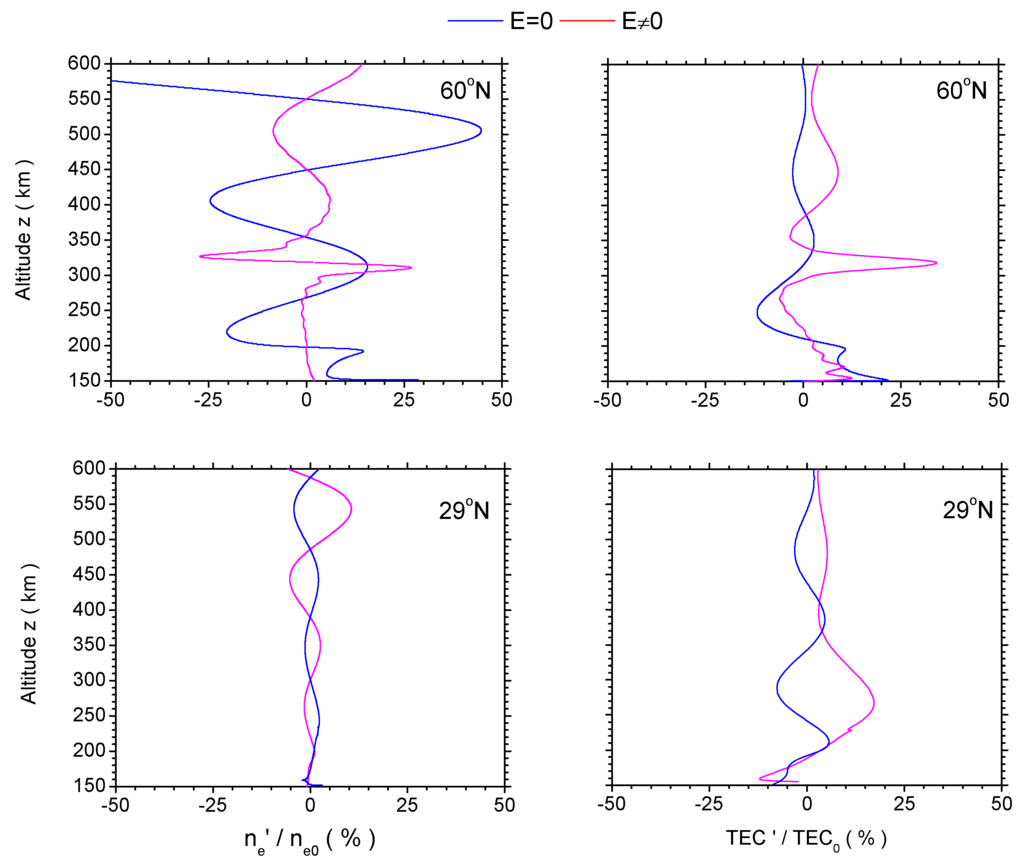 The effect of an ionospheric dynamo electric field on the electron density and total electron content (TEC) perturbations in the F layer (150–600 km altitudes) is investigated at two arbitrarily selected locations (noted as 29° N and 60° N in latitudes) in the presence of seismic tsunami-excited gravity waves propagating in a stratified, nondissipative atmosphere where vertical gradients of atmospheric properties are taken into consideration. Generalized ion momentum and continuity equations are solved, followed by an analysis of the dynamo electric field (E). The E-strength is within several mV/m, determined by the zonal neutral wind and meridional geomagnetic field. It is found that, at the mid-latitude location, is dominated by the atmospheric meridional wind when , while it is determined by the zonal wind when . The perturbed TEC over its unperturbed magnitude lies in around 10% at all altitudes for , while it keeps the same percentage at most altitudes for , except a jump to >25% in the F2-peak layer (300–340 km in height). By contrast, at the low-latitude location, the TEC jump is eliminated by the locally enhanced background electron density.
