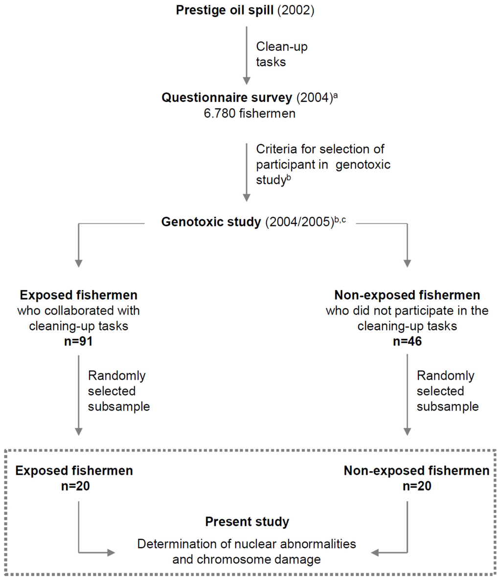 - Hildur, K.; Templado, C.; ZocK, J.P.; Giraldo, J.; Pozo-Rodríguez, F.; Frances, A.; Monyarch, G.; Rodríguez-Trigo, G.; Rodriguez-Rodriguez, E.; Souto, A.; et al. Follow-up genotoxic study: Chromosome damage two and six years after exposure to the Prestige oil spill. PLoS ONE 2015, 10. [Google Scholar] [CrossRef]