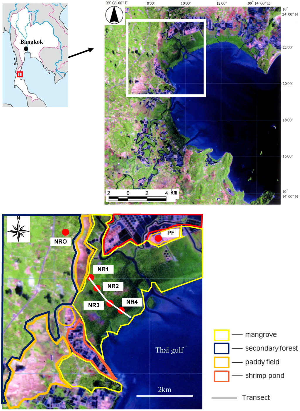 Location of study site is indicated by a white square in Landsat image. The transect was made by crossing different mangrove vegetation types. Boring survey was conducted in mangrove ecosystem (NR1–NR4), coconut plantation (NR0), and paddy field (PF).