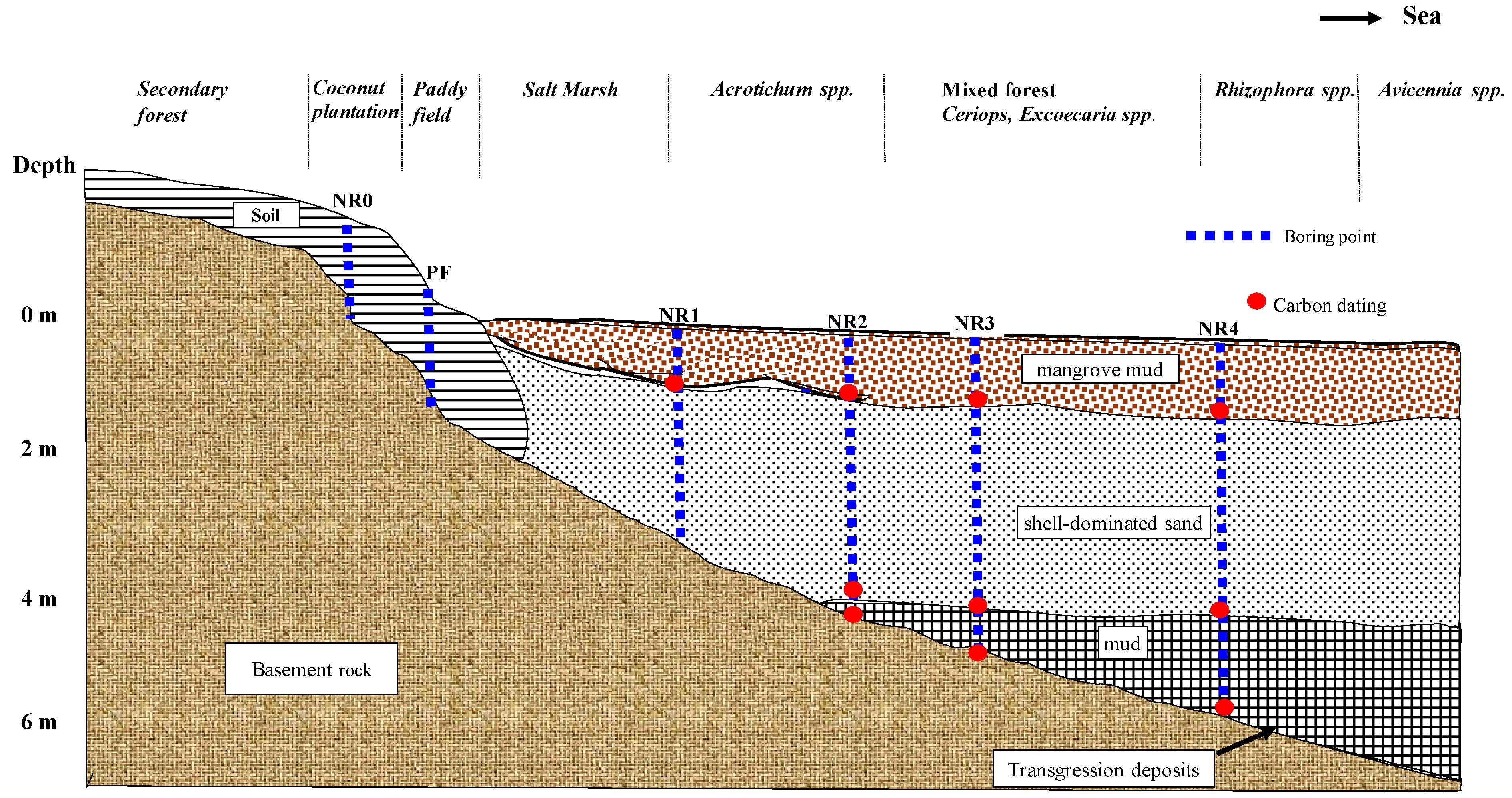 A comparison of the carbon dating results obtained from different locations in the mangrove mud layer revealed that sedimentation was likely to start earlier inland than offshore. This was in agreement with the idea that the mangrove ecosystem was developing in the offshore direction. The distance between NR1 and NR4 was 2000 m, and their sedimentation times differed by 500 years. By computing those values, it was found that the mangrove would have moved 4 m seaward per year.