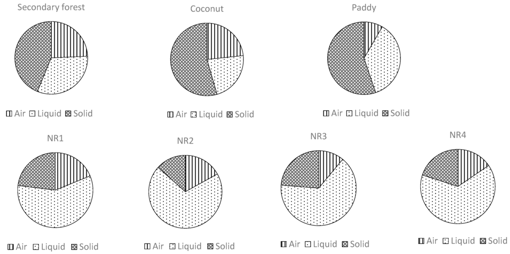 | Land type and depth (cm) | Air | Liquid (%) | Solid | Porosity | Bulk density (g/mL) | pH | EC (dS/m) | Total-C (%) | Total-N (%) | CN |