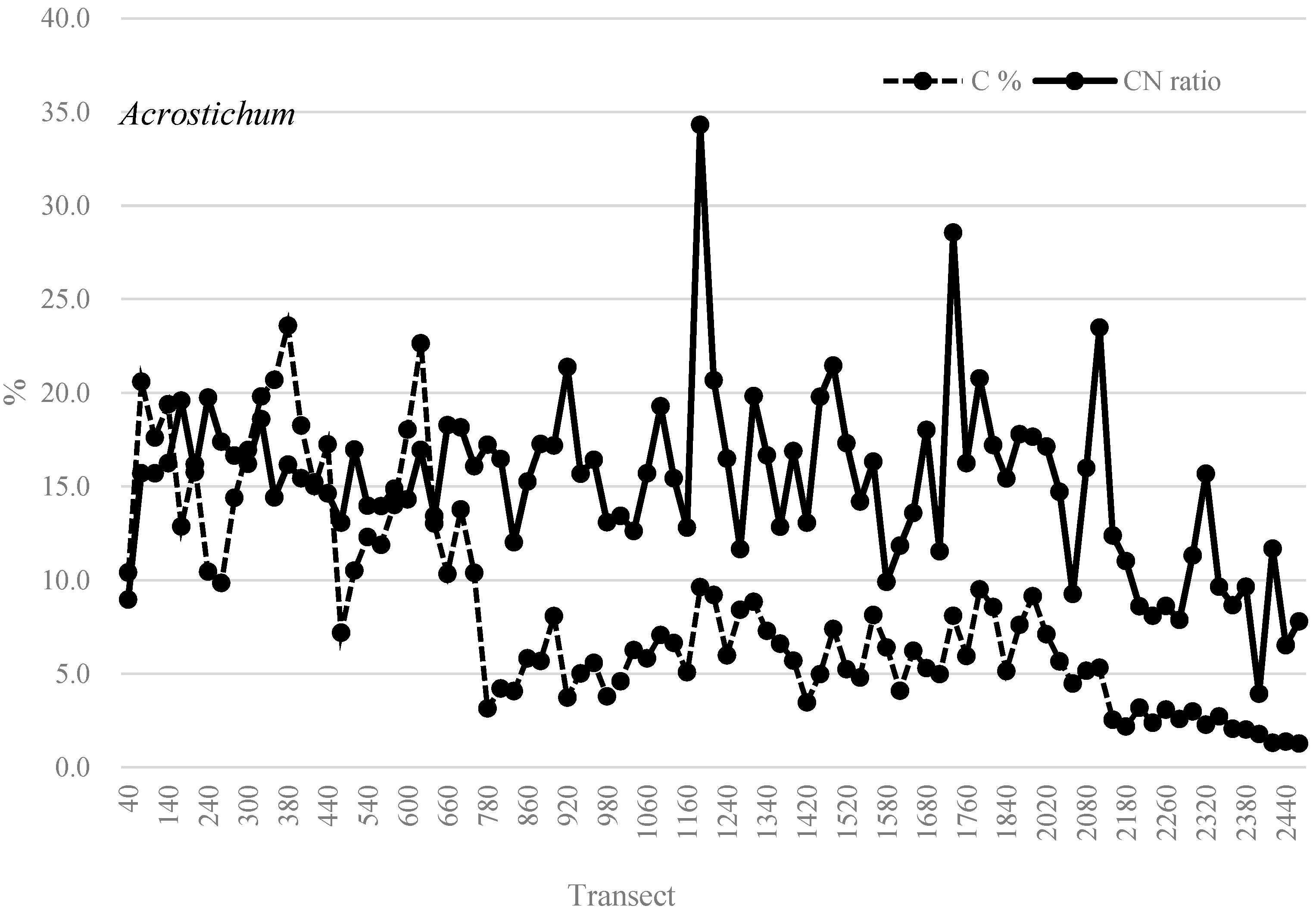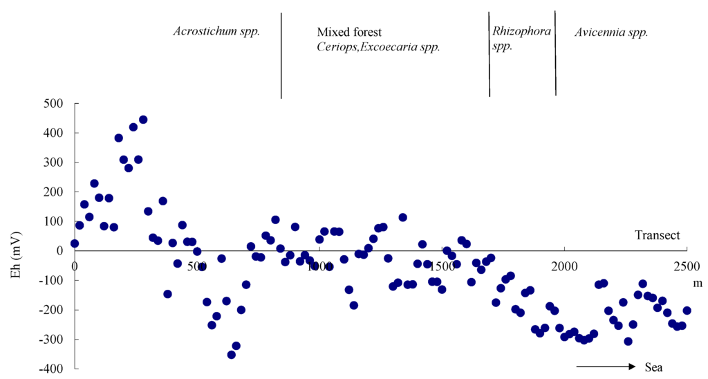 Surface soil OC content in mangrove stands varied greatly depending on the vegetation type along the 2500 m long transect. The large variations in δ13C and the C/N ratio in surface soil indicated different sources, namely, autochthonous and allochthonous. The pH and Eh gradients were important factors affecting OC stock and the mobility/uptake of chemical elements. P and Mg content in the leaf increased with increasing pH. Mangrove species showed preference for uptake of particular elements. Eh was positively correlated with OC content, and OC content became high when Eh was positive in the Acrostichum spp. zone. The significant fluctuation of Eh in the Acrostichum spp. zone could be caused by human disturbance in the form of excavation. OC in the mangrove mud layer was characterized by high aliphatic content, indicating that the soils were not yet humified and were susceptible to decomposition.