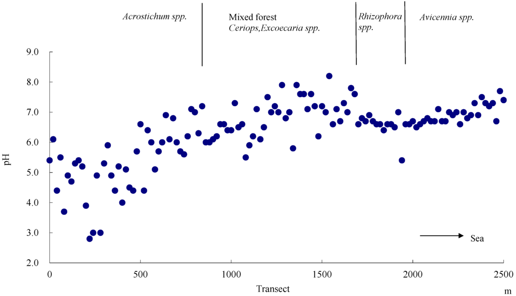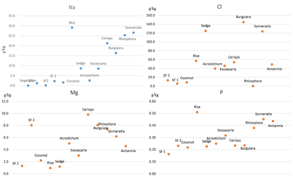 Leaves were collected in June 2013 from different vegetation zones in mangrove ecosystems and terrestrial zones. Sampled plant species were sedge (Cyperus microiria), Acrostichum (mangrove associate), Excoecaria, Ceriops, Bruguiera, Rhizophora, Sonneratia, Avicennia which were in wetland, and secondary forest (species names were not identified), coconut tree, rice which were in the terrestrial zone. Fifty young leaves were collected from each type of vegetation, as it was reported that fifty was a reliable number for use as bioindicators of heavy metal contamination [31]. The leaves were immediately washed with distilled water to remove adhered matter, and dried. The dried leaves were pulverized by a mixer to make composite leaf samples. The composite leaf samples were digested by adding 5 mL of conc. HNO3, and the mixture was left to stand overnight at room temperature for pre-digestion. Thereafter, another 5 mL of conc. HNO3 was added, and the entire mixture was heated on a hot plate at 75 °C for 0.5 h, 130 °C for 0.5 h, and 200 °C for 2 h. The mixture was filtered through a membrane filter (pore size 0.45 µm), and the filtrate was used as the analysis solution for the determination of macro and micro elements, such as Na, Mg, Al, Si, P, S, Cl, K, Ca, Mn, and Fe, by an ICP-MS instrument (Model SPQ 8000A, Seiko Instruments, Chiba, Japan).