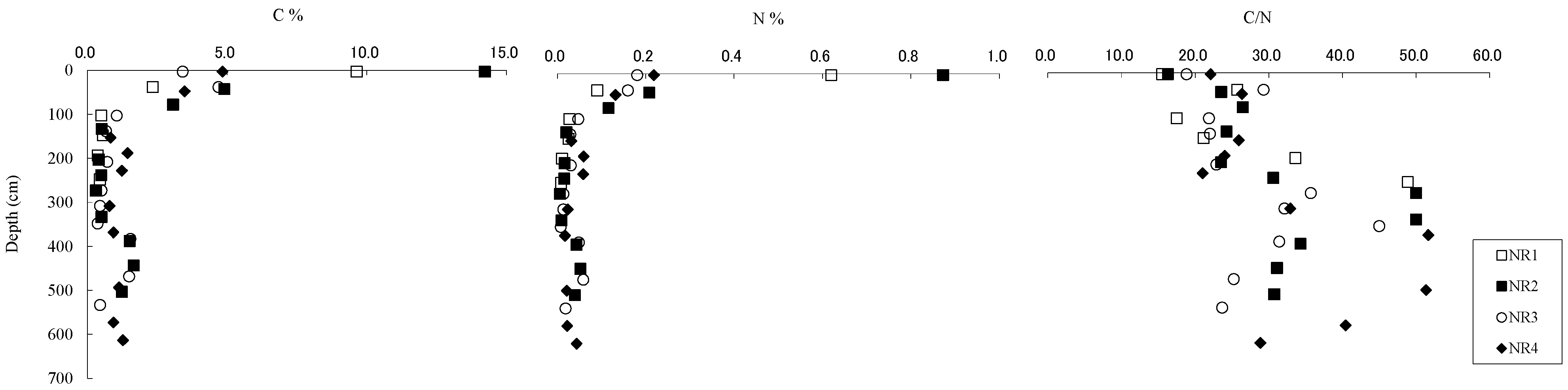 - Lamb, A.L.; Wilson, G.P.; Leng, M.J. A review of coastal palaeoclimate and relative sea-level reconstructions using δ13C and C/N ratios in organic material. Earth Sci. Rev. 2006, 75, 29–57. [Google Scholar] [CrossRef]