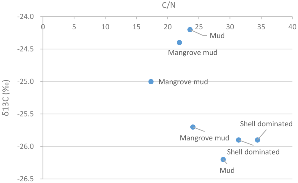 Bulk sediment δ13C and C/N values were the result of autochthonous inputs from wetland vegetation and allochthonous sources, such as algae and particulate organic matter [49,50,51]. δ13C (‰) in organic sediment was between −26‰ and −24‰ (Table 7), which resembled that of terrestrial carbon sources, whose range was between −33‰ and −25‰ [52], and of fresh water phytoplankton δ13C, whose range was between −30‰ and −25‰ [53]. However, δ13C (‰) in the mangrove mud layer varied greatly (Figure 9), which might indicate diverse source, i.e., not only terrestrial but also marine source.