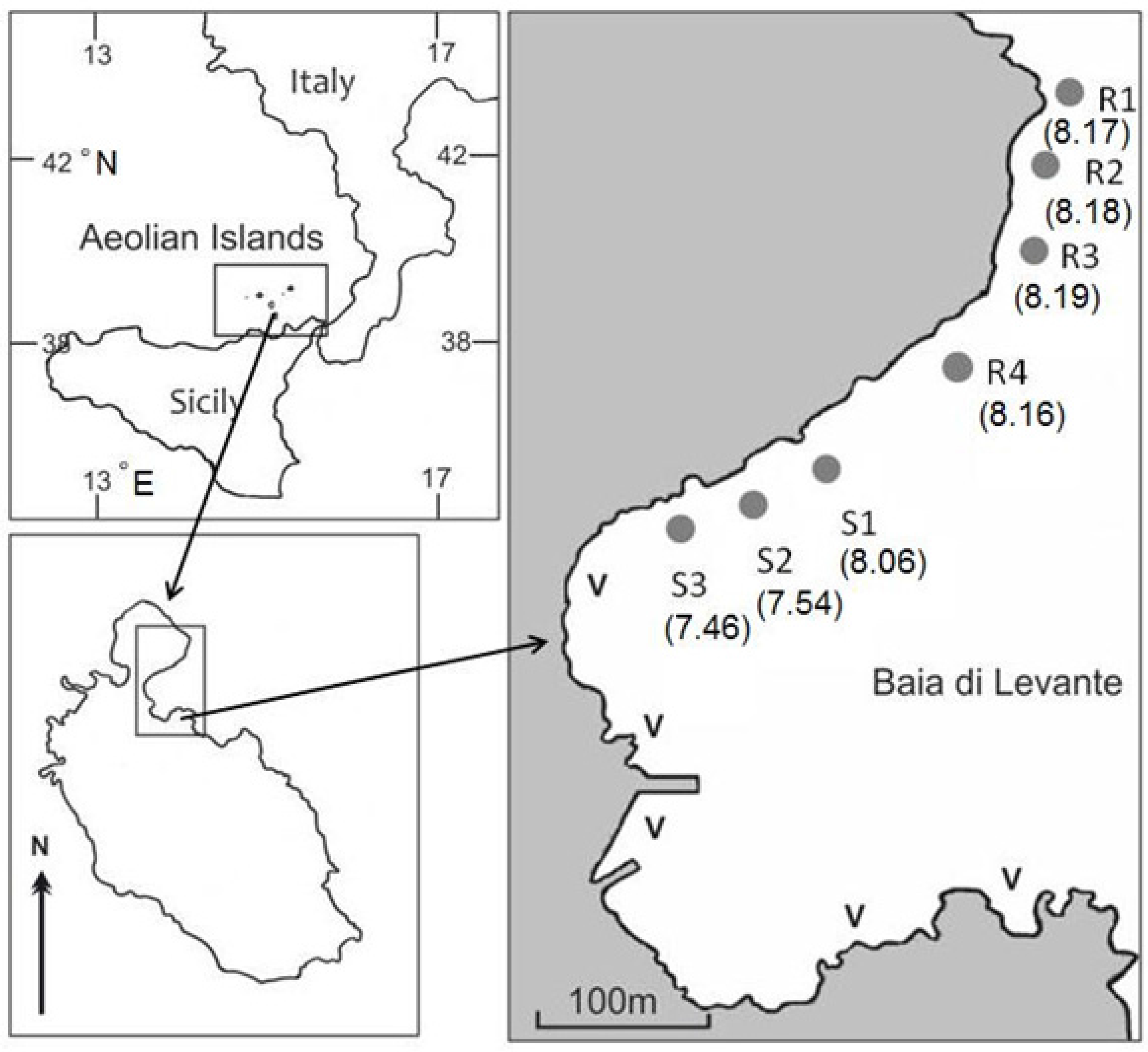 - Boatta, F.; D’Alessandro, W.; Gagliano, A.; Liotta, M.; Milazzo, M.; Rodolfo-Metalpa, R.; Hall-Spencer, J.M.; Parello, F. Geochemical survey of Levante Bay, Vulcano Island (Italy) and its suitability as a natural laboratory for the study of ocean acidification. Mar. Pollult. Bull. 2013, 73, 485–494. [Google Scholar] [CrossRef] [PubMed]