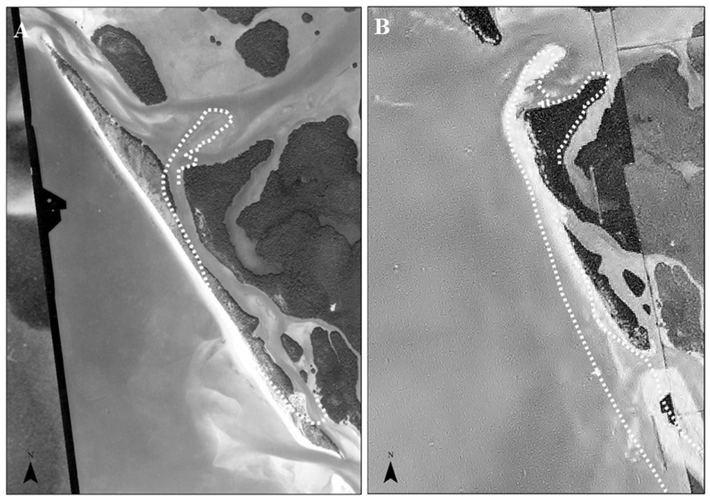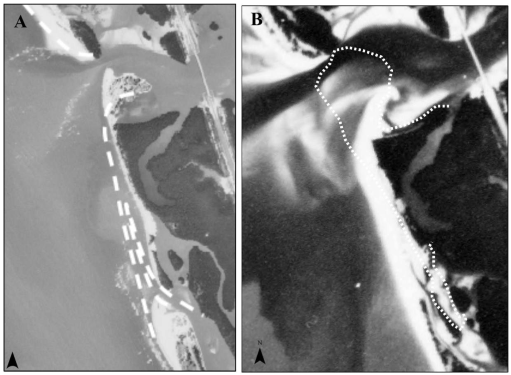 Morphologic changes of Big Hickory Island. (A) 1970 aerial photograph with the approximate 1980 shoreline shown as a white dashed line (from [25] with permission from Pelican Landing Community Association); (B) 1980 aerial photograph with the approximate 1996 shoreline shown as a white dashed line.
