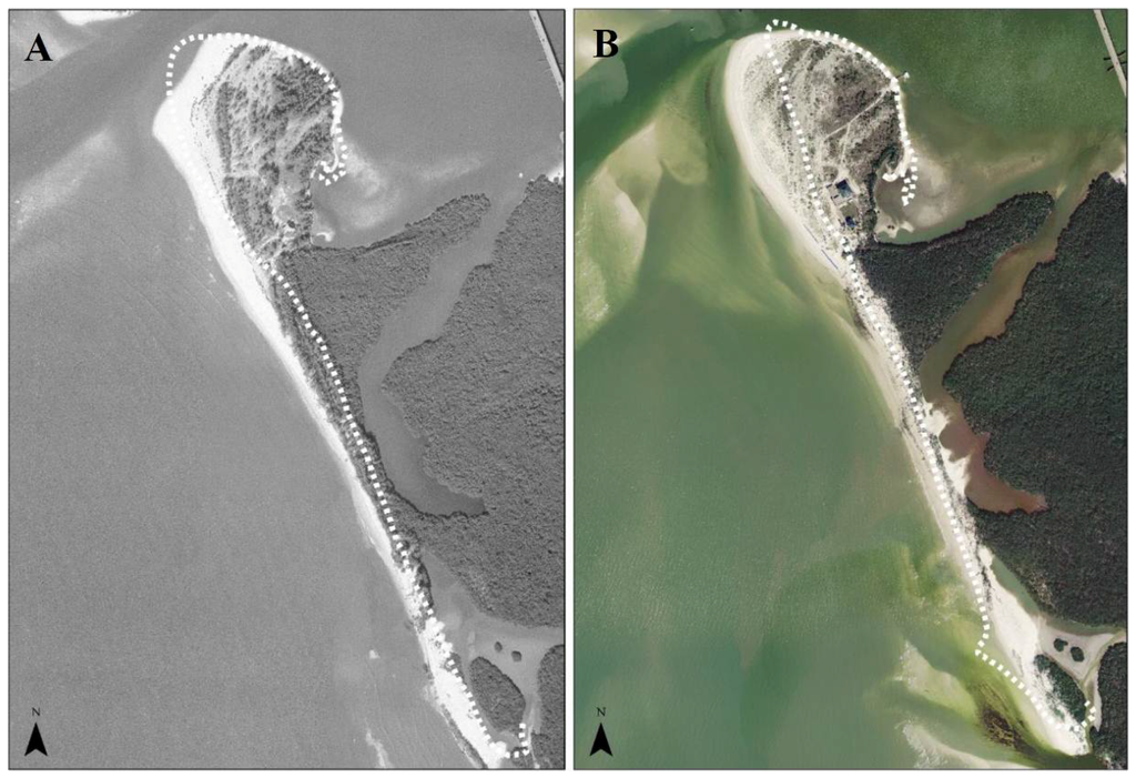 Near-term morphodynamics are established through an analysis of aerial photography (obtained from Lee County and the University of Florida Libraries) and available literature on historical shoreline change on Big Hickory Island [25,30] from 1944 through 2012. Historical aerial photographs (i.e., prior to 1996 in this study), were georeferenced using Geographic Information System (GIS) software and identifying control points from a rectified (NAD83 State Plane FL West) 1996 image [31] prior to shoreline digitization.