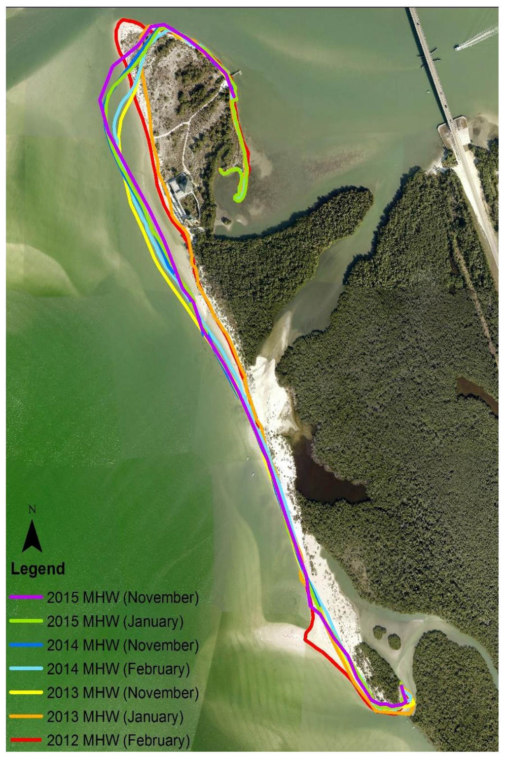 Morphologic changes of Big Hickory Island between 2012 and 2015, represented by the Mean High Water (MHW) line surveyed bi-annually, shown on a 2012 aerial photograph.