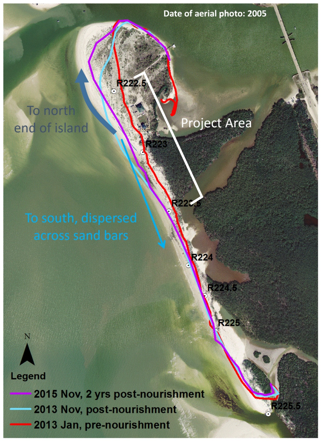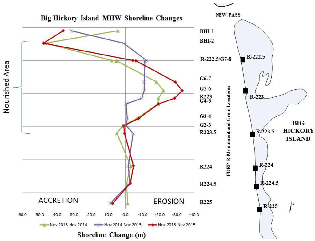 Tabulated annual shoreline change from construction completion (November 2013) to November 2015 at the FDEP R-monuments is given in Table 1. The average shoreline change during the first two years after project construction, from November 2013 to November 2015, was a landward movement of 5.4 (± 12.2) meters. The large standard deviation (σ) implies significant alongshore variability. The greatest shoreline change in the project area occurred at R223, which represents roughly the center of the beach nourishment perturbation. Note that no standard R-monuments exist north of the project area in the volatile region adjacent to New Pass. Shoreline change immediately south of the project area was negative (representing landward change or erosion); whereas, change along southern Big Hickory Island, adjacent to Big Hickory Pass was positive or accretional (Figure 6).