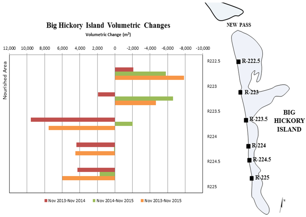 A total of 7132 yd3 of sediment volume change (gain) was measured across the Big Hickory Island study area from R222.5 to R225.5 from November 2013 to November 2015. Based on R-monument calculations, the nourished area was erosional, while the area located to the south (from R224 to R225) was accretional. This corresponds to the planform spreading pattern noted in the previous section.