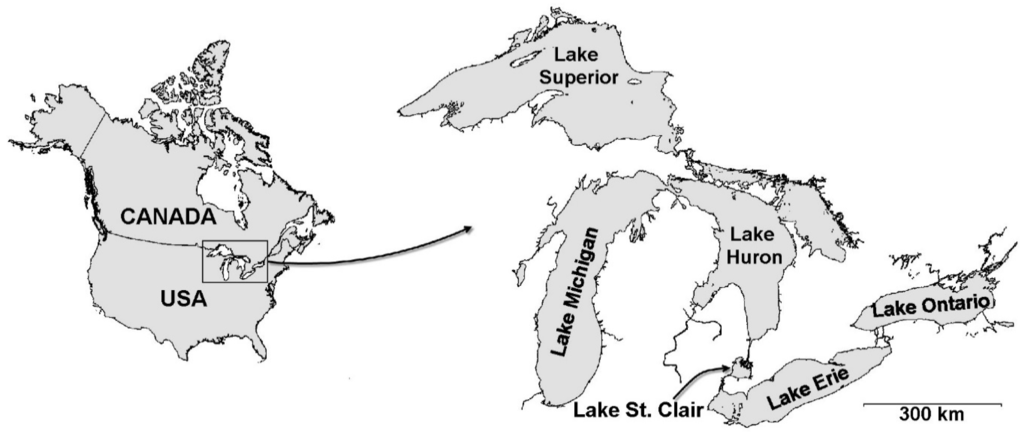 The Laurentian Great Lakes of North America are made up of five major water bodies that contain approximately 20% of the world’s fresh water resources. Canada and the United States rely heavily on these lakes, making up about 84% of North America’s water supply and approximately 90% of the United States water supply [1,2]. There are numerous threats to the productivity, health, and sustainability of water resources in the Great Lakes Basin. This is due to the interrelationship of lake and river ecosystems. Among the worst threats are chemical spills and dumping, habitat destruction from land use change and climate change, and the introduction of invasive species disrupting ecological functions and the food chain [2]. Among the Great Lakes are smaller lakes, rivers and channels that connect these water bodies to the St. Lawrence Seaway, creating an interconnected freshwater and marine ecosystem. Lake St. Clair (Figure 1) is a small lake located in the northwestern portion of the Lake Erie Basin that connects Lake Erie and Lake Huron via the St. Clair River and the Detroit River.