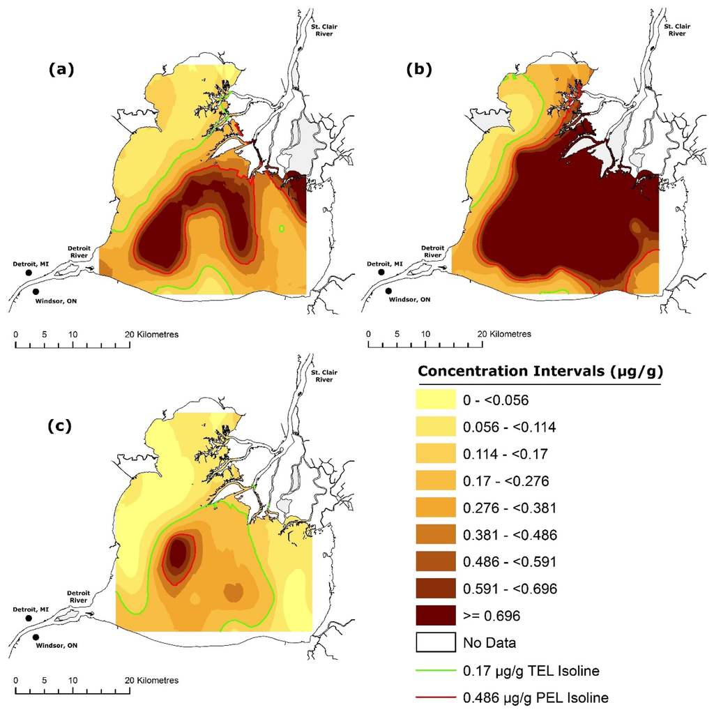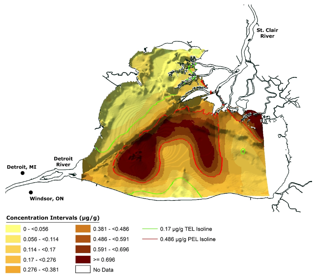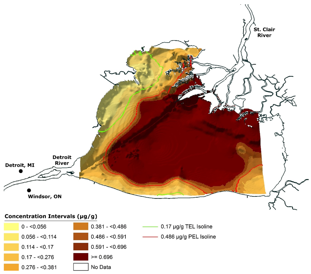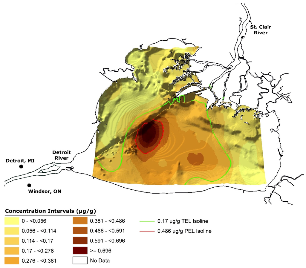 Lake St. Clair has elevated levels of various contaminants in the water and sediment column including lead, mercury, polychlorinated biphenyls (PCBs), cadmium, and several chlorinated compounds due to the long history of petroleum and industrial manufacturing along the St. Clair River [3]. Among these contaminants, mercury can be claimed as the most notable as it is considered a persistent toxic substance by the Canadian Environmental Protection Act due to its ability to bioaccumulate, reduce fertility, impede biological development, and have lethal effects on human and marine life at high concentrations [4].