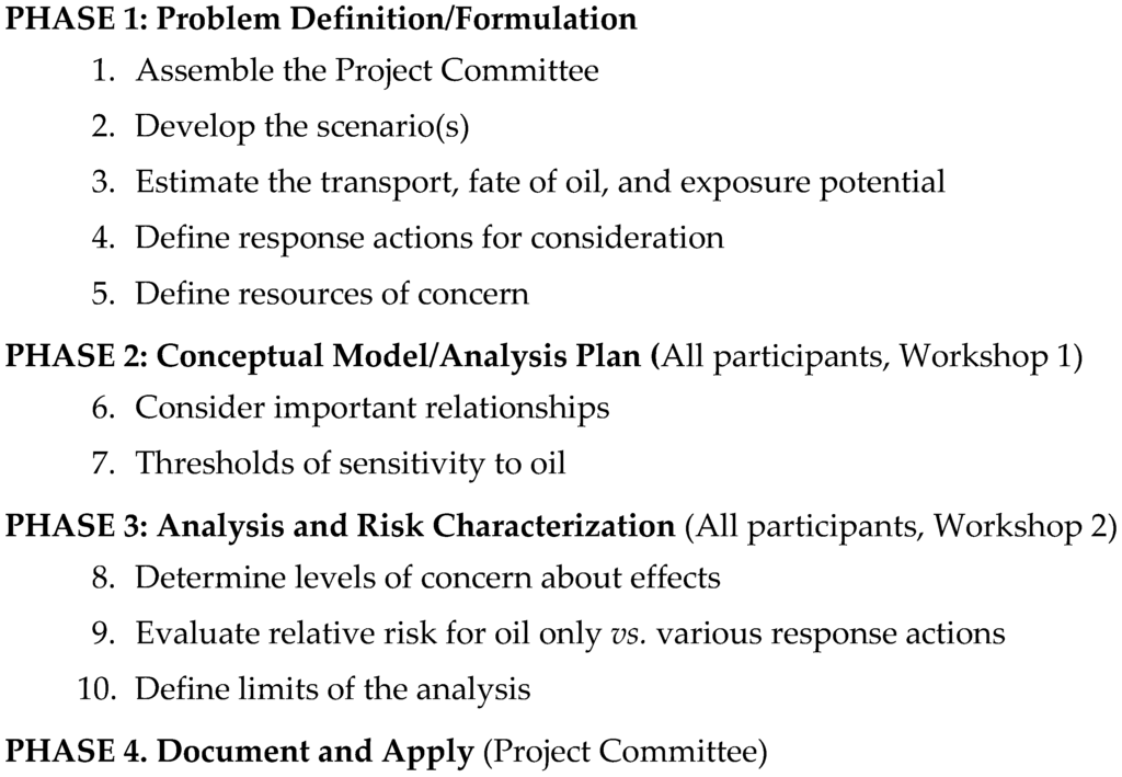 A variety of risk assessment approaches are available; for example the NEREIDs [32] supported by cooperation of marine research centers in Greece, Cyprus and the United Kingdom, along with a multinational incident report database advances cross-border civil protection and marine pollution cooperation for direct response to natural and man-made disasters. Modeling of oil spills in confined maritime basins using bathymetric and geomorphic data has been used to identify risks to vulnerable and sensitive coastlines [28,29,33]. In 1998, Aurand [34] proposed adapting EPA’s Ecological Risk Assessment (ERA) approach, which was first developed in 1992 to assess ecological effects caused by human activities, for use in oil spill planning [35]. The goal was to facilitate resolution of disagreements over the potential risks and benefits of alternative response technologies, i.e., dispersants and in-situ burning, compared to traditional mechanical containment and recovery actions. In 1998, the concept was put into practice for the first time in a set of meetings in the Puget Sound area [36]. This initial effort clearly demonstrated the need for, and challenges with, reconciling concerns among environmental response professionals with diverse expertise and responsibilities about which response actions would have the lowest collateral damage and would reduce the risks of impacts from spilled oil. The situation was more complex than just committing to the use of ecological risk assessment methods to overcome skepticism and concerns about the environmental risks of using dispersants and in-situ burning in addition to mechanical recovery during oil spill response. Based on the Puget Sound ERA, the process was revised to place more emphasis on facilitated risk communication and qualitative risk assessment, and less emphasis on attempts to quantify the details related to a hypothetical event. The revised process, which emphasizes reaching agreement among the risk management team, stakeholders, and interested parties, has been referred to as a Consensus Ecological Risk Assessment (CERA).