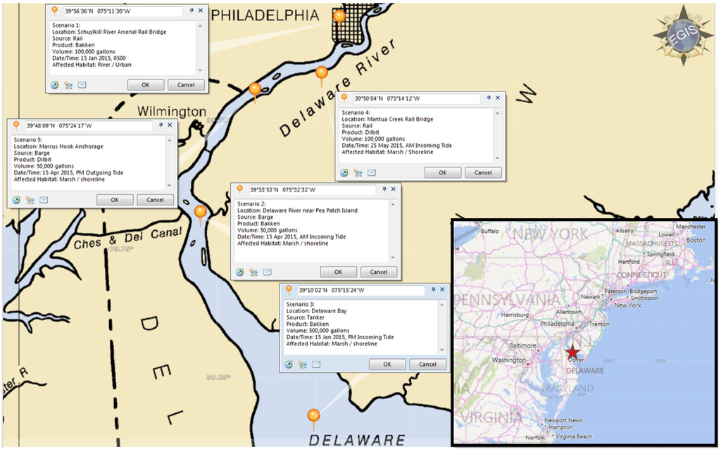Scenario 1 occurs at a rail crossing within Philadelphia’s urban setting; Scenario 2 involves a barge in the middle of the Delaware River near Pea Patch Island, an ecologically and culturally-sensitive resource; and Scenario 3 involves a tanker in the open water of upper Delaware Bay.