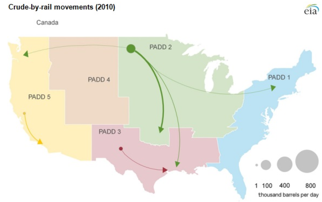 Crude-By-Rail Movements of Bakken and dilbit in 2010, tracked by Petroleum Administration for Defense District (PADD) regions [43].
