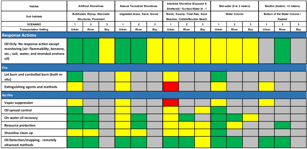 The gray cells scored “Not Applicable” refer to the absence of either the resource of concern in a scenario or the lack of pathway for exposure to the hazard presented by the oil or type of response action. For example, in Scenario 3, which involves a spill of Bakken oil in the upper Delaware Bay in winter, during the first 4–6 h, the risk to shorelines and benthos were scored as Not Applicable because the oil would not reach those environments in that time frame.