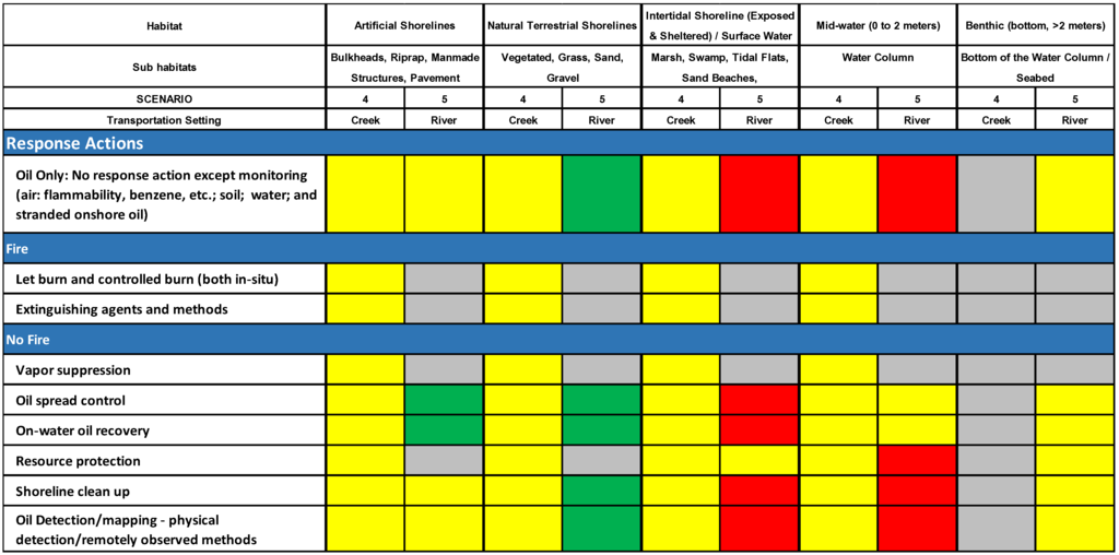 In the initial 4–6 h after a Bakken spill occurs in these scenarios, the response actions that positively change, i.e., decrease the risk (change a yellow to a green score) compared to the NAM are: Scenario 1—oil spread control, on-water recovery, resource protection, shoreline cleanup, and remotely observed oil detection/mapping in the mid-water habitat (Scenario 1). In the initial 4–6 h after a Bakken spill occurs in these scenarios, the response actions that negatively change, i.e., increase the risk (change a green to a yellow score) compared to NAM are: Scenario 1—oil spread control, on-water recovery, resource protection, shoreline cleanup, and remotely observed oil detection/mapping in natural terrestrial shorelines.