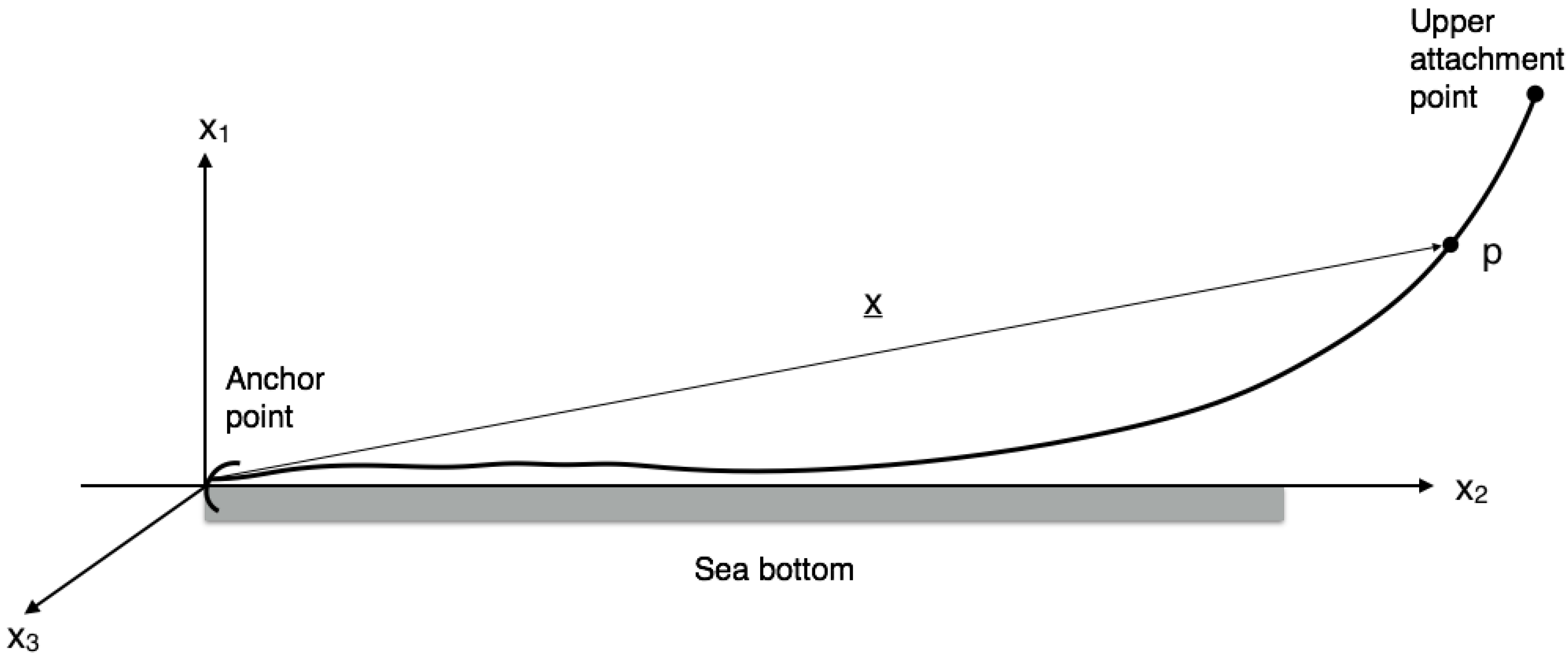 In Equation (1), x = [x1 x2 x3]T is the position vector of the cable in a Cartesian coordinate system with the origin at the anchor point, the coordinate x1 directed vertically upwards perpendicular to the sea bottom and the coordinate x2 horizontally in the plane of the resting cable. The sea bottom is assumed to be flat, horizontal and parallel to the mean sea surface. See Figure 1. The terms in Equation (1) represent forces per length unit of unstretched cable. The first term is the mass inertia force on the cable. The second and third terms are forces perpendicular to the cable that arise due to the acceleration in the water. The forth term is the reaction force of the cable. Finally, the fifth term, f, represents the external forces. The hydrodynamic forces due to the acceleration in the water (second and third term) and the drag forces contained in the external forces (fifth term) due to the relative velocity in the water are derived from the common Morison equation, and follows ideas in [27].